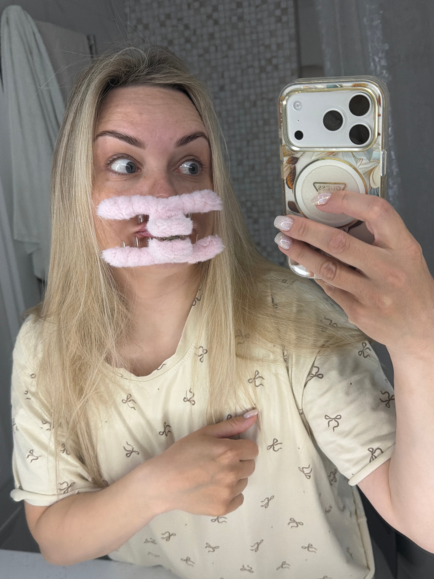A blonde-haired woman is taking a selfie. She is wearing a surgical bandage over her nose and staples are visible. She is wearing a light-colored shirt with a bow pattern. She is holding an iPhone in…read more