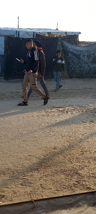 The scene is an unpaved, sandy expanse in Khan Yunis, Palestinian Territory, illuminated by a clear sky. Long shadows stretch across the ground from left to right. In the background, multiple makeshif…read more