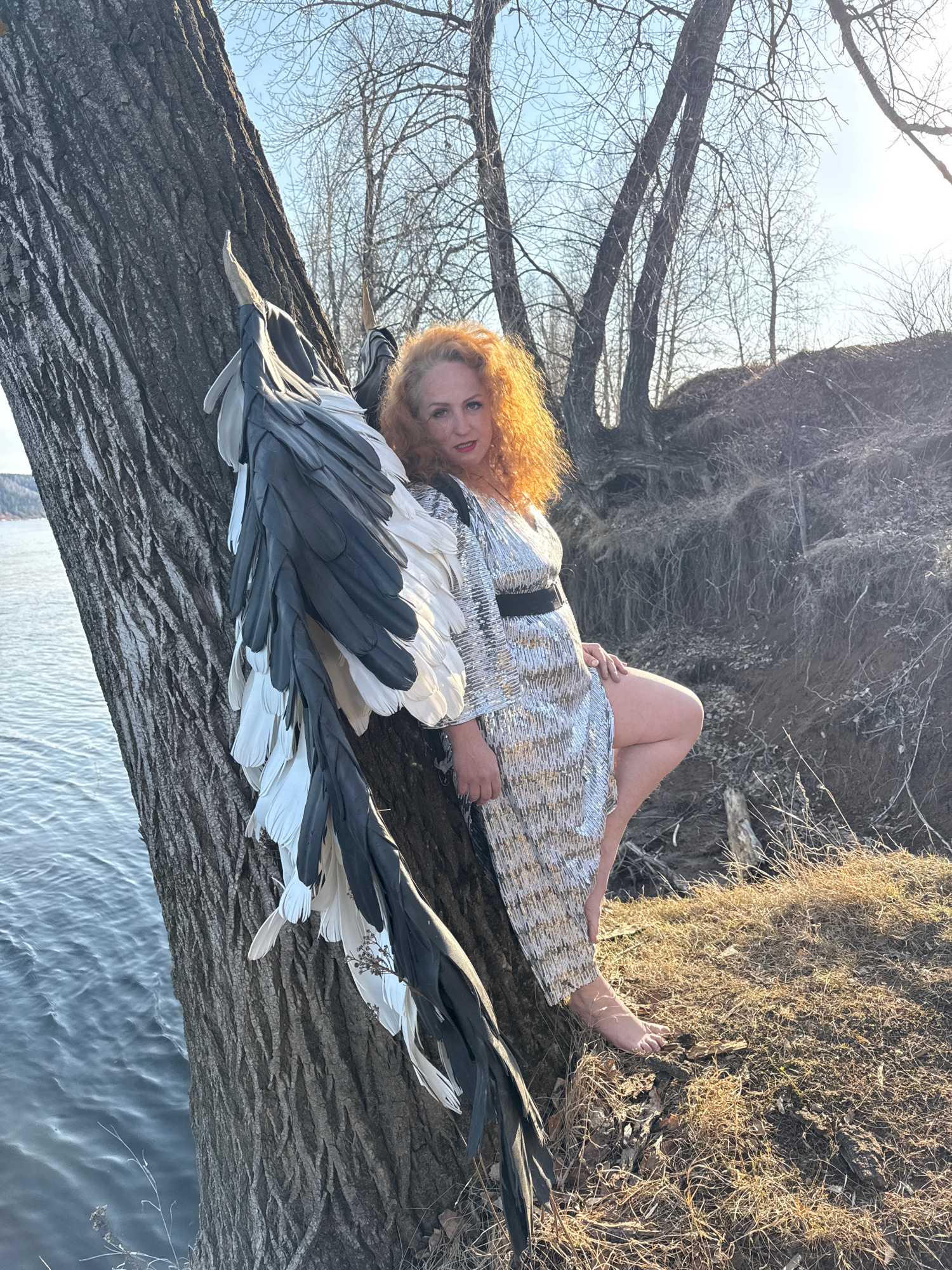 A woman with curly auburn hair lies on a tree trunk. She wears a shiny, silver-toned dress with a black belt. A pair of large black and white wings are near her on the tree. The location appears to be…read more