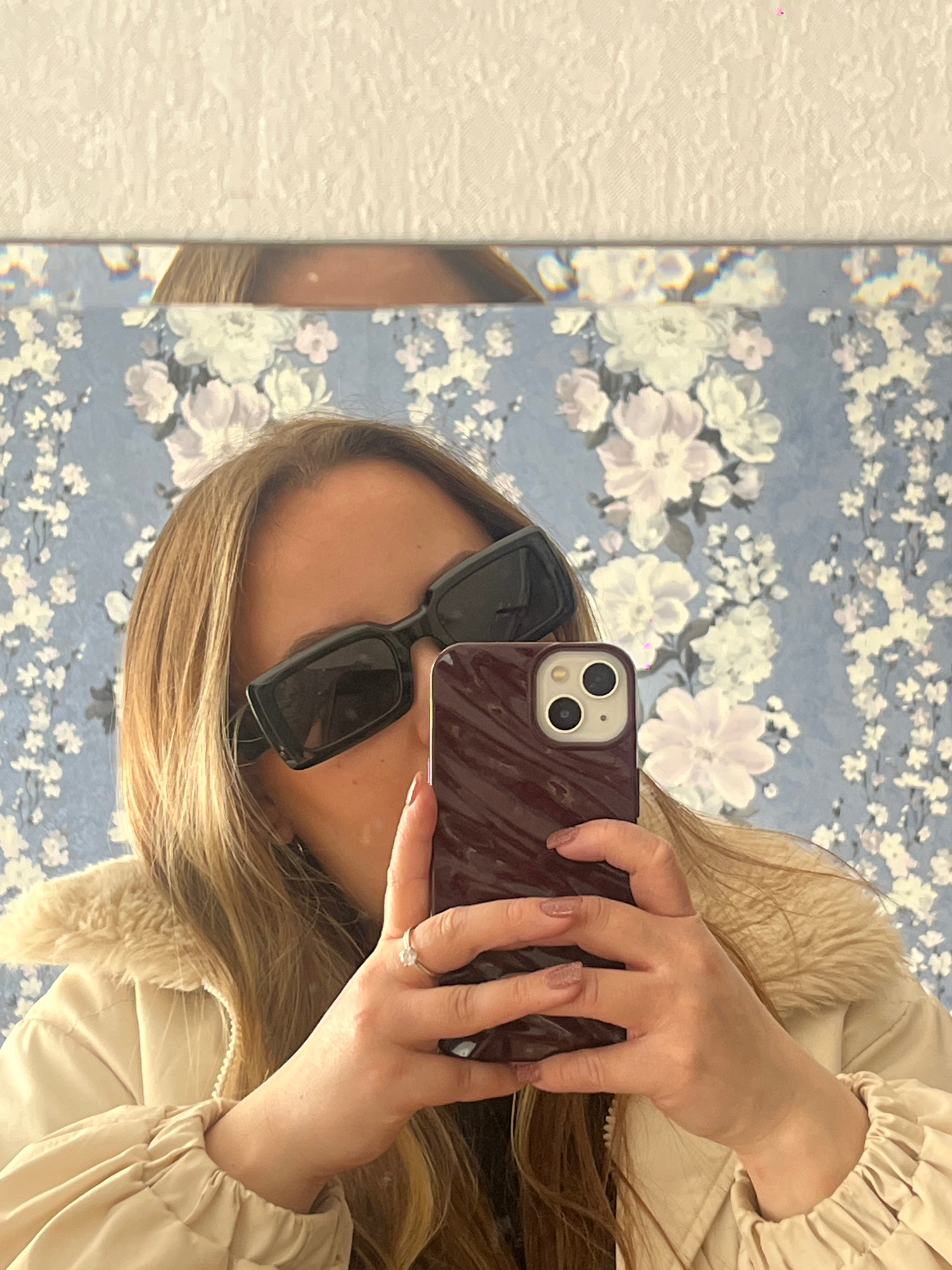 A fair-skinned individual is taking a selfie in front of a mirror with a floral-patterned background. They are wearing sunglasses and a light-colored jacket with a furry lining. The individual is hold…read more