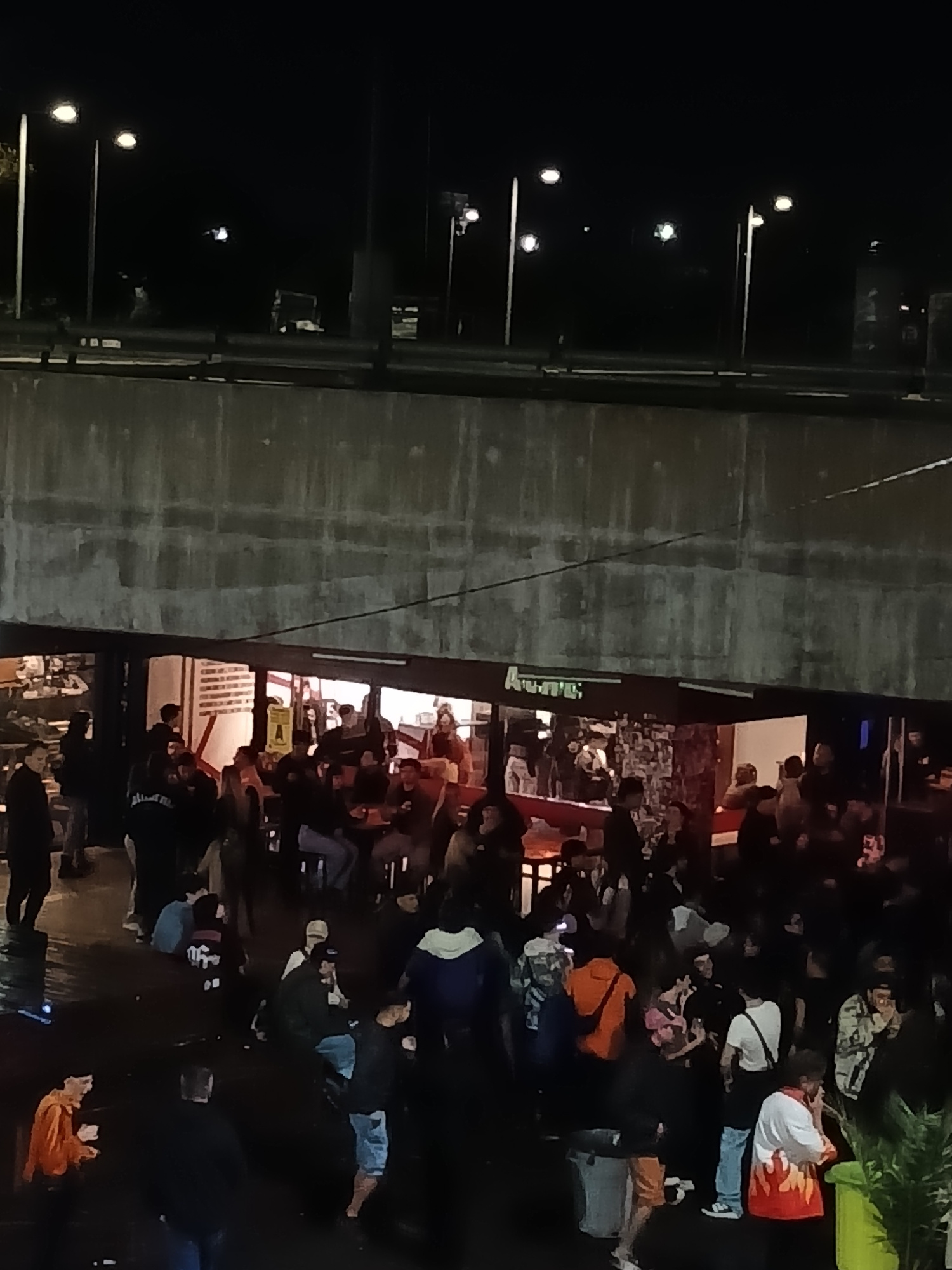 The image shows a crowded outdoor area in Buenos Aires, Argentina, possibly a restaurant or bar. People are seated at tables and standing, seemingly engaged in conversation and dining. The background features a large concrete structure, likely an overpass or building wall, and streetlights are visible in the distance. The scene is illuminated by artificial lights, indicating it is night. The environment is urban, with evidence of pedestrian traffic and commercial activity. | Open Wire