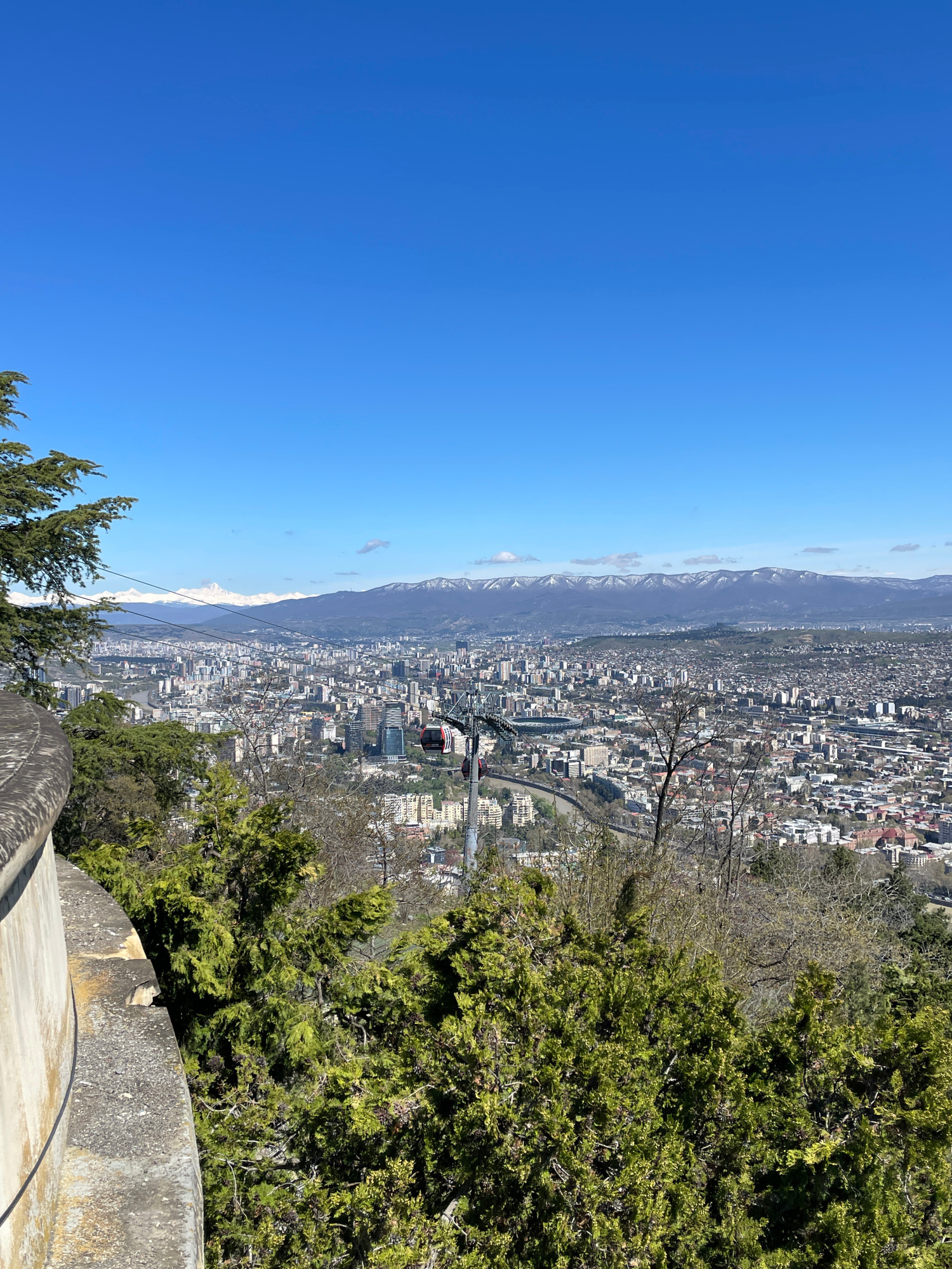 The image shows an elevated view of the city of Tbilisi, Georgia, on a clear, sunny day. In the foreground, there are evergreen trees and a portion of a concrete or stone structure, possibly a viewing…read more