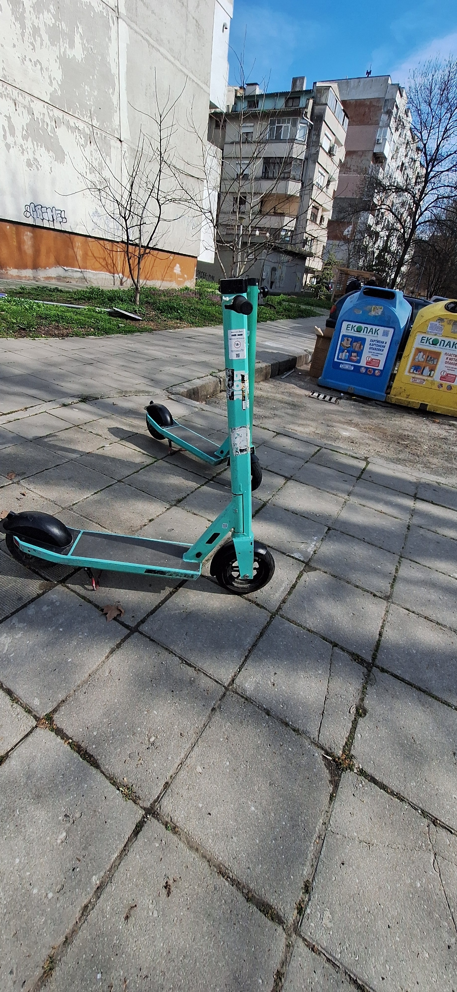 The image shows a Bolt scooter parked on a sidewalk in Burgas, Bulgaria. The scooter is light blue/green with black wheels. It appears to be in a public area, possibly a park or residential neighborho…read more