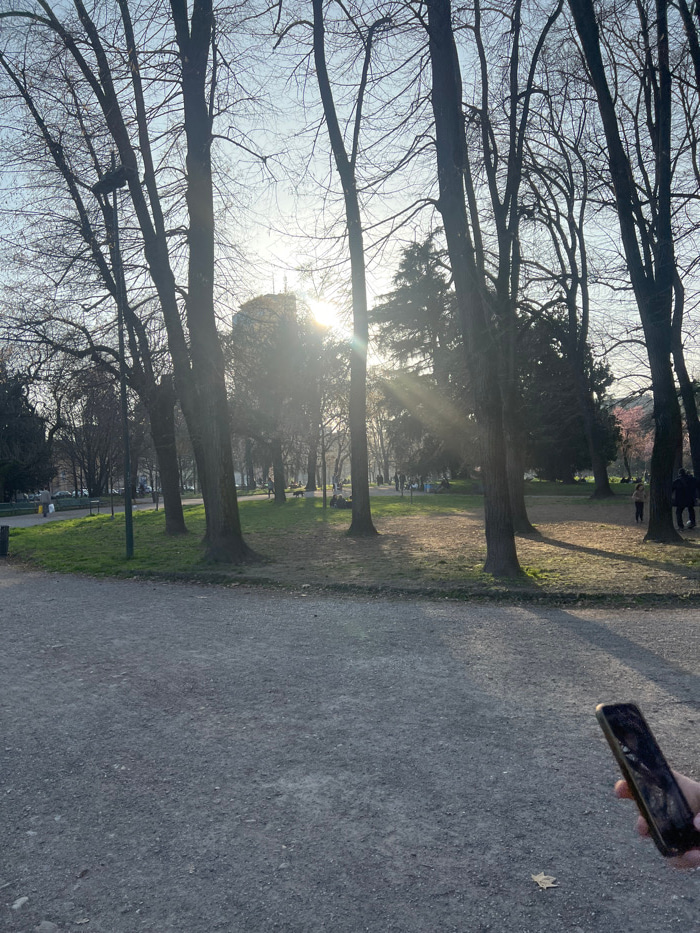 The image captures an outdoor park scene, identified as the Giardini Pubblici Indro Montanelli in Milan, Italy, during what appears to be late afternoon or early evening, evidenced by the low sun angl…read more