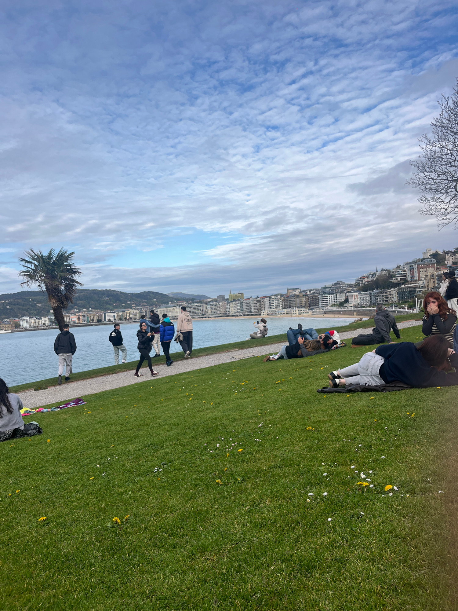 The image depicts a scene in San Sebastián, Spain, with a view of the cityscape along the coastline. The foreground shows a grassy area with scattered white and yellow wildflowers. A pathway runs para…read more
