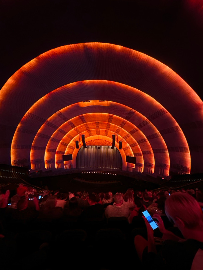 The photo depicts the interior of a large concert hall or theater from an elevated perspective. Orange, concentric rings adorn the ceiling, illuminated to create a warm glow. The stage area is visibleβ¦read more