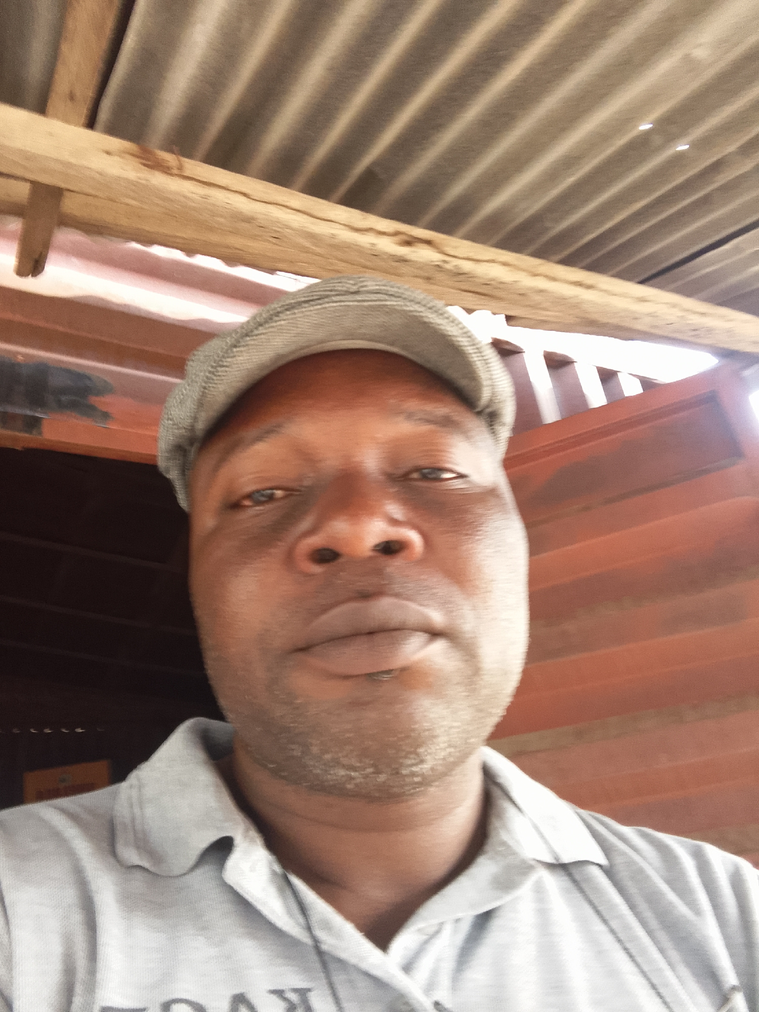 A close-up, low-angle portrait features a man with dark skin, wearing a light grey flat cap and a light grey polo shirt. He looks directly into the camera with a neutral expression. Bright light illum…read more