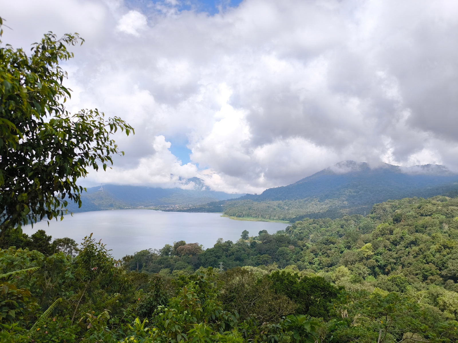 The image depicts a scenic view overlooking a lake, likely one of the lakes near Wanagiri, Indonesia. Dense green foliage dominates the foreground and extends into the midground, covering the slopes l…read more