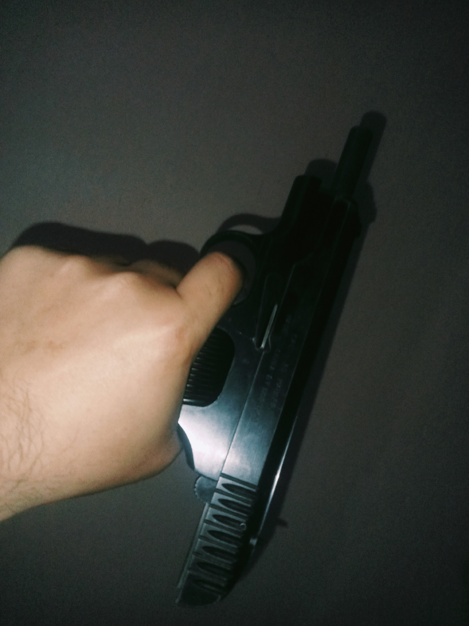 A close-up, angled photograph captures a light-skinned human right hand actively gripping a dark-colored semi-automatic pistol. The hand's thumb is positioned near the firearm's rear action, with fing…read more