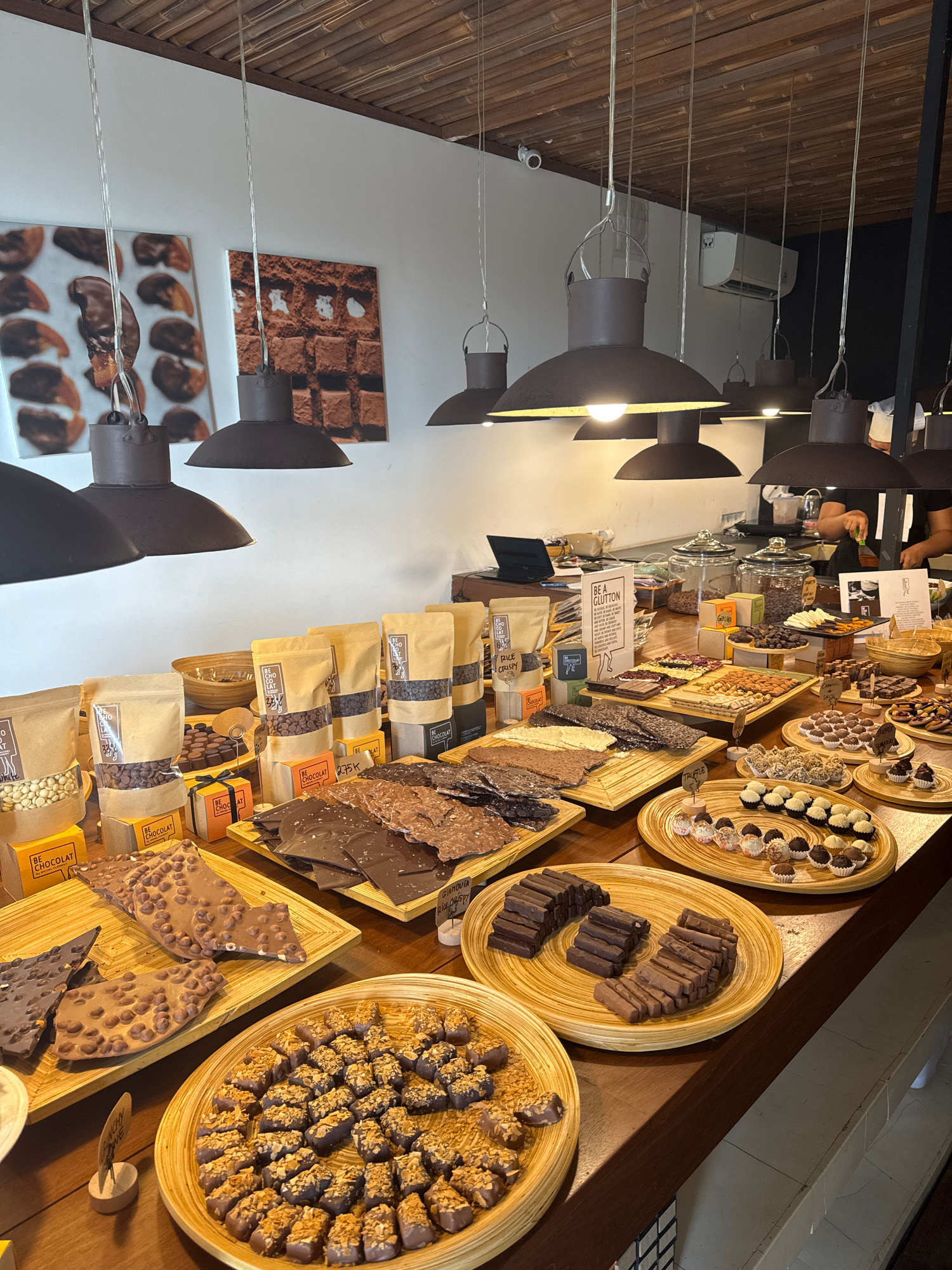 The image captures a brightly lit retail setting, likely a chocolate shop, showcasing a variety of chocolate products. The scene is in North Kuta, Indonesia. **People:** * There are partial views o…read more