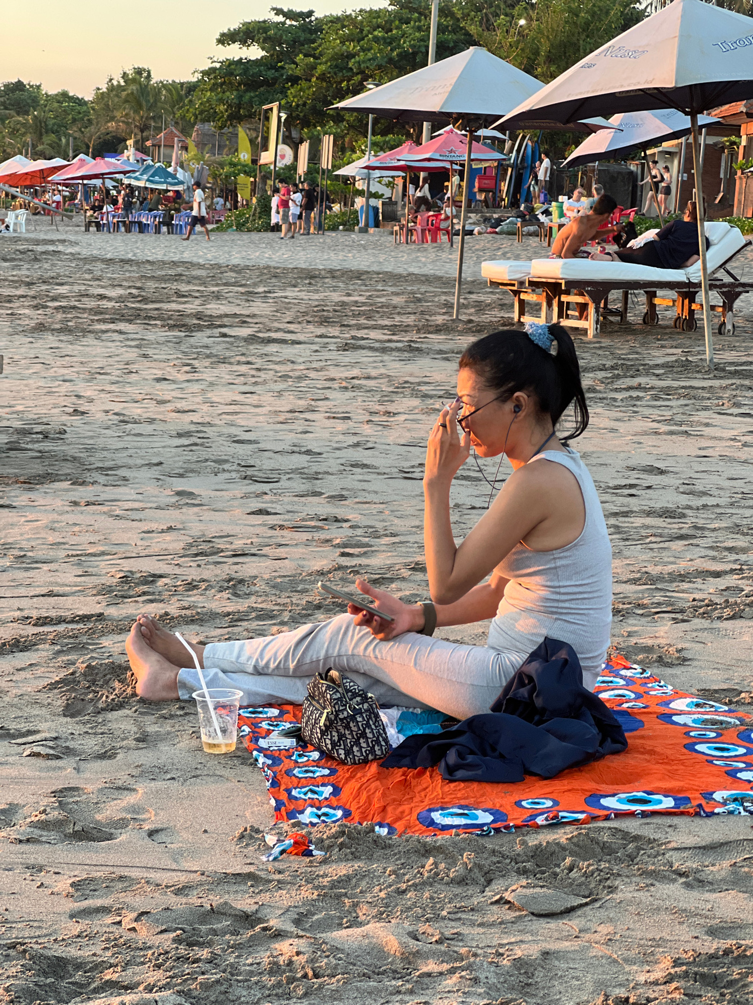 A beach scene in Kuta, Indonesia, is depicted during the golden hour, likely late afternoon or early evening. The image is rotated 90 degrees clockwise from its intended landscape orientation. In the…read more