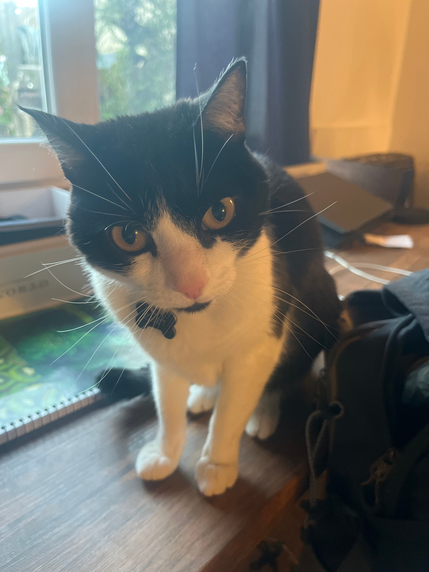 A black and white cat is lying on a table or desk, looking directly at the camera. The cat has a pink nose and amber eyes. In the background, there is a blurred window with greenery visible outside. T…read more