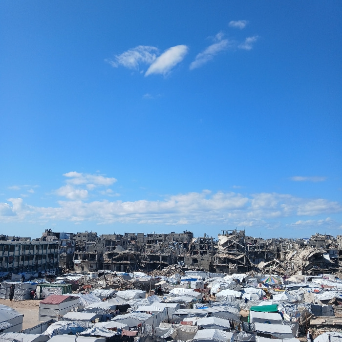 The image depicts a wide view of a severely damaged urban landscape in the city of Gaza, Palestinian Territory, under a bright blue sky with scattered white clouds. In the middle ground, numerous multi-story concrete buildings are extensively destroyed, reduced to skeletal remains, rubble, and piles of debris. Exposed rebar and broken concrete slabs are visible across the structures. Below this devastation, occupying the entire foreground, is a densely packed encampment of temporary shelters. These shelters are primarily white or light-colored tents and tarpaulins, varying in size and shape, erected on what appears to be a sandy or dirt ground. Some tents feature darker blue or green tarps, and one distinct tent has a red-colored roof. A few indistinct human figures are faintly discernible moving amongst the tents in the encampment. The scene presents a sharp contrast between the expanse of destroyed architecture and the crowded temporary living structures. | Open Wire