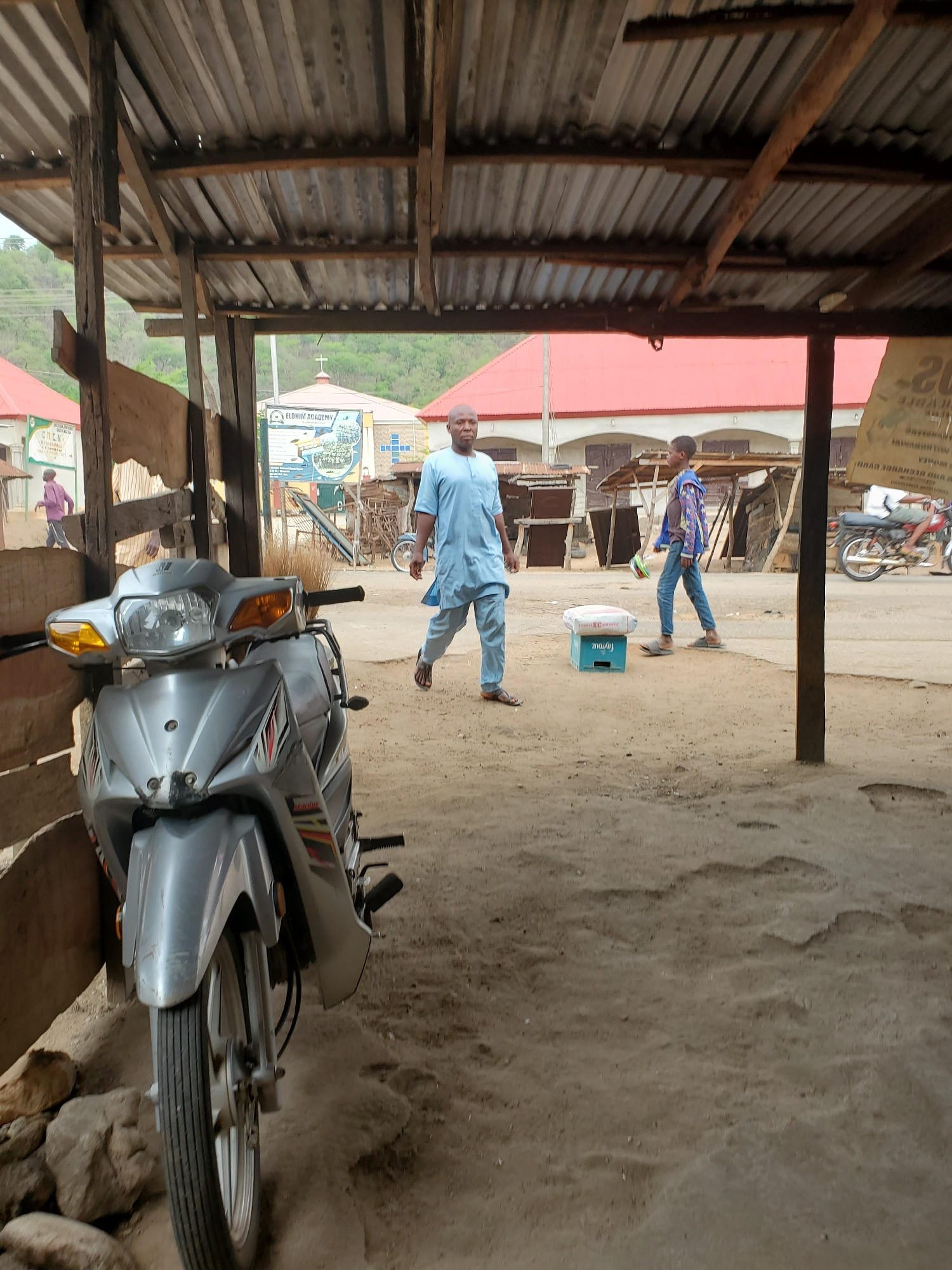 The scene is an outdoor shot in Mararaba, Nigeria, taken from beneath a corrugated metal roof structure with exposed wooden supports. A silver motorcycle dominates the foreground. An adult male wearin…read more