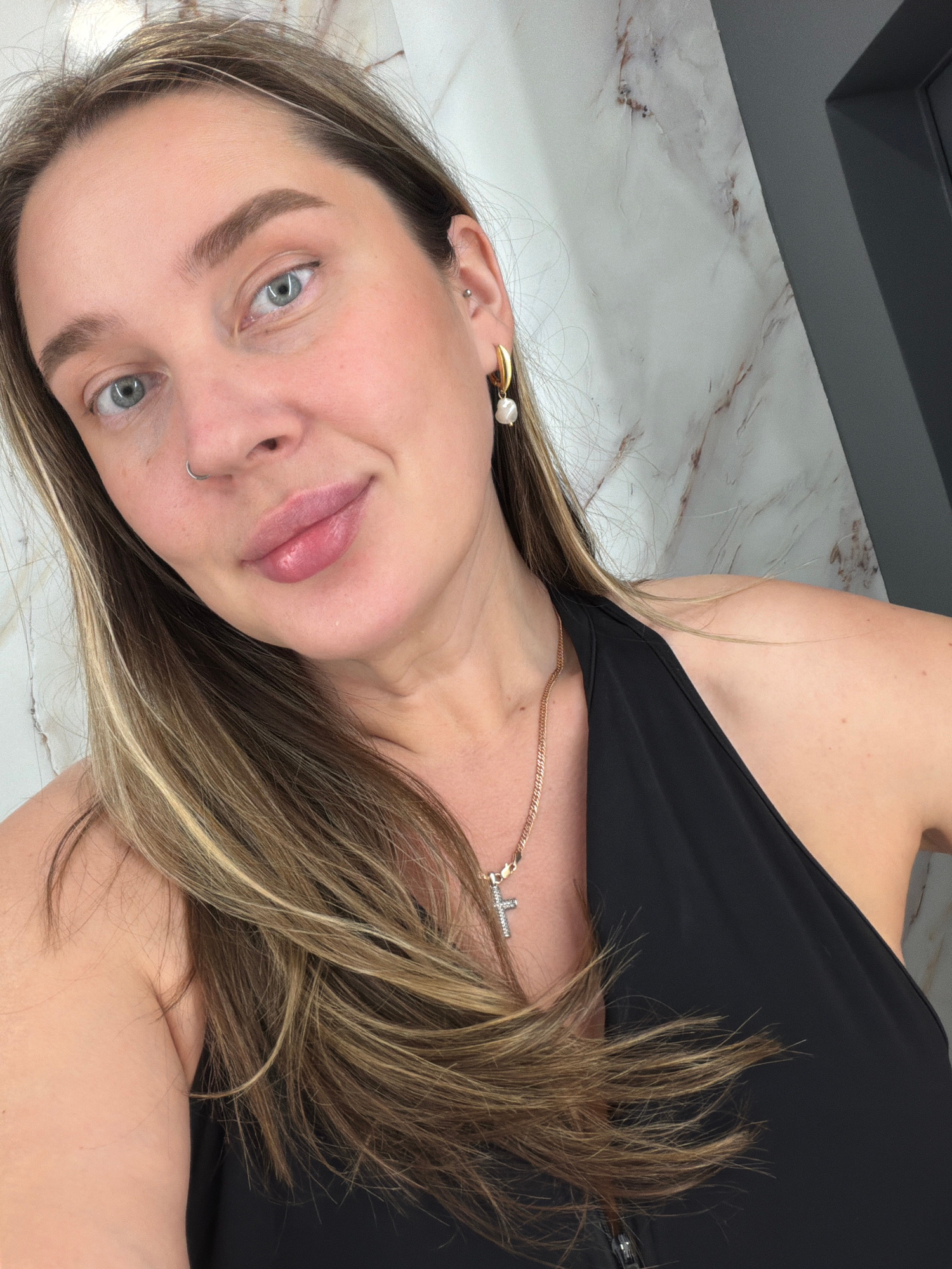 A selfie-style image depicts a woman with fair skin, light brown hair with blonde highlights, and blue eyes. She is wearing a black sleeveless top and a gold necklace with a small cross pendant. She h…read more