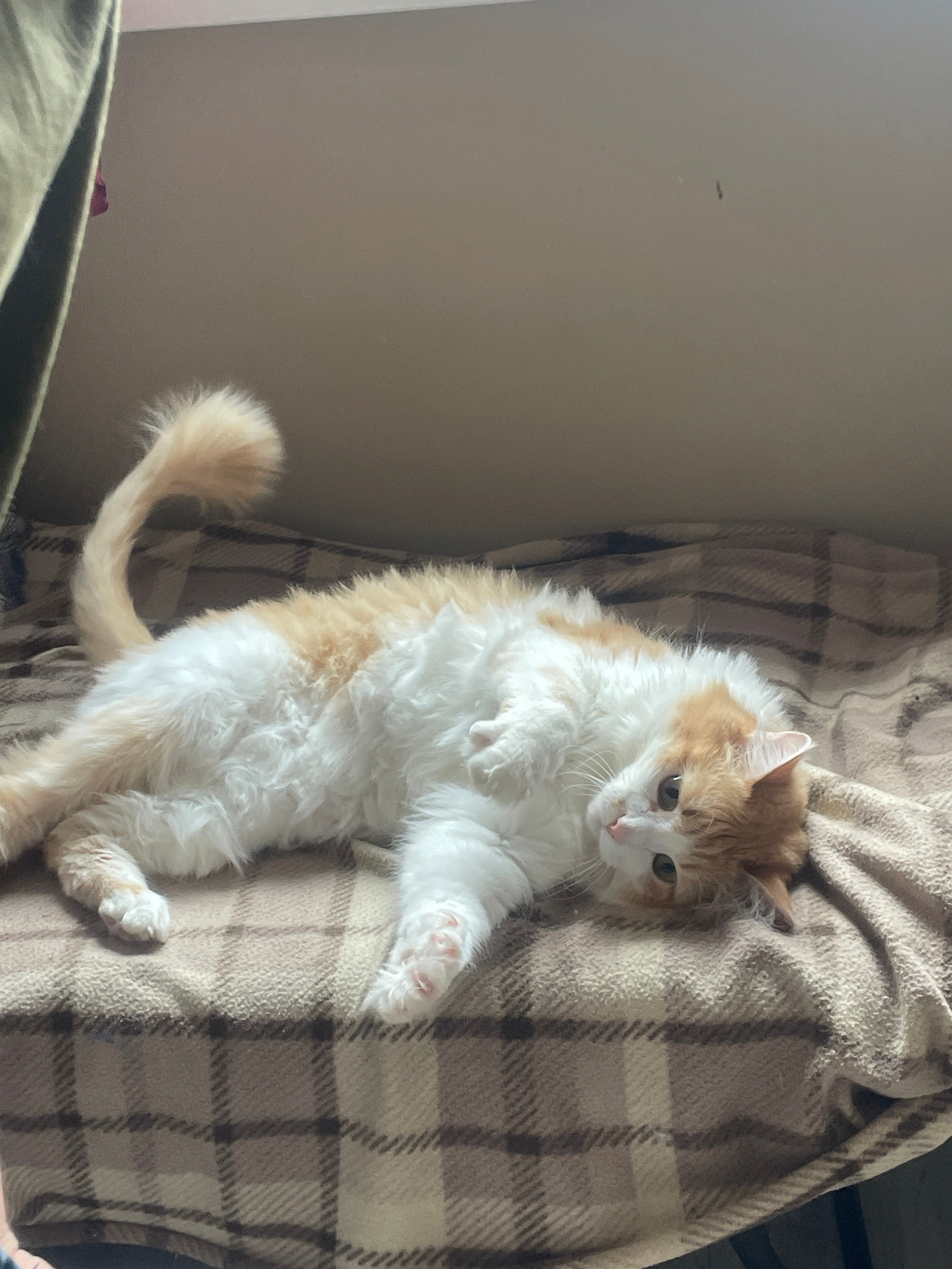 A long-haired cat with white and orange fur is lying on its back on a plaid blanket. The cat has its paws up, and its tail is curled to the left. The background is a light beige wall and a green objec…read more