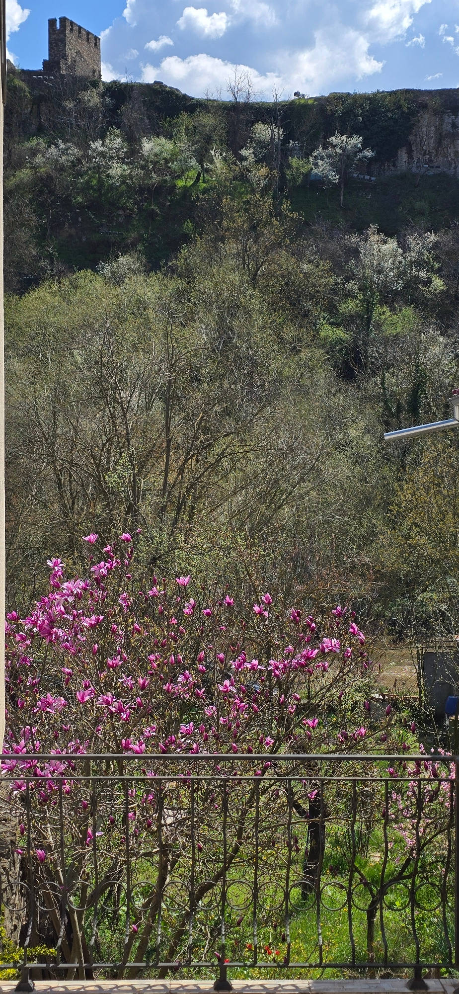 The image captures a view in Veliko Tarnovo, Bulgaria, looking towards the city's historical landscape from behind an ornate iron railing. A fortress with a crenellated tower is visible against a back…read more