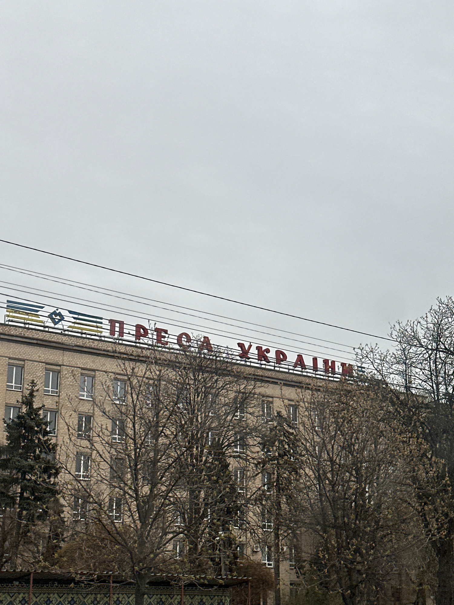A low-angle shot of the "Press of Ukraine" building in Kyiv. The building is constructed of light-colored brick and has multiple windows on each level. The red Cyrillic text "ПРЕСА УКРАЇНИ" is promine…read more