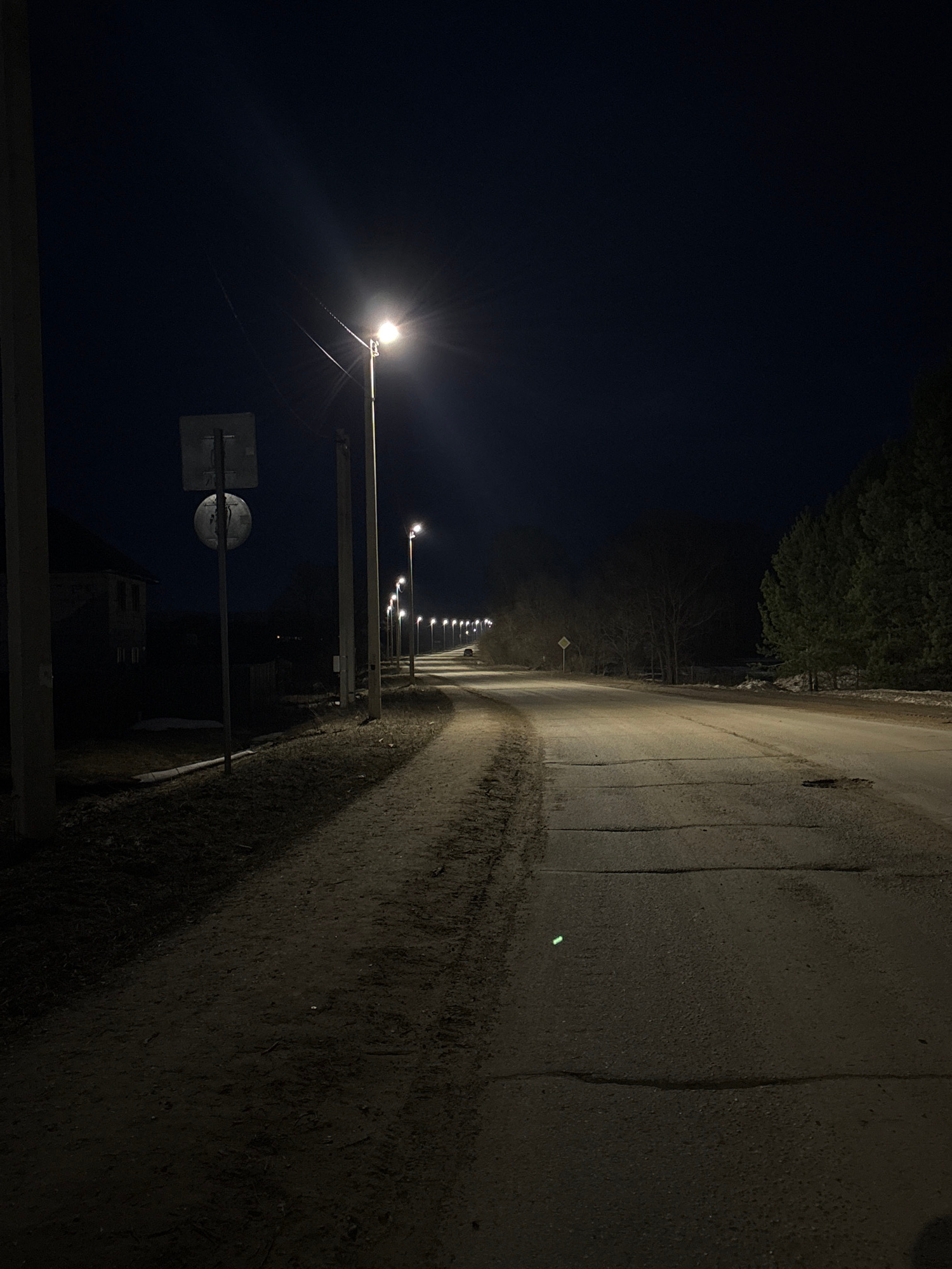 The image shows a dimly lit road in what appears to be the edge of a town or a rural area at night. Streetlights are visible along the road, providing the main source of illumination. A road sign is l…read more