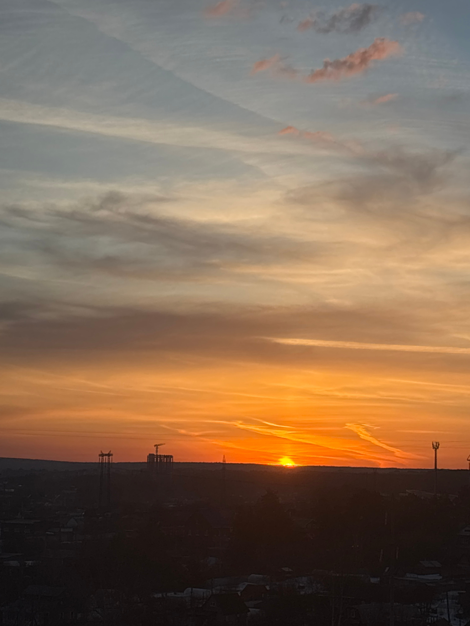The image captures a sunrise in the city of Chaikovsky, Russia. The sky transitions from blue with hints of pink clouds on the left to a vibrant orange near the horizon on the right. The sun is partiaβ¦read more