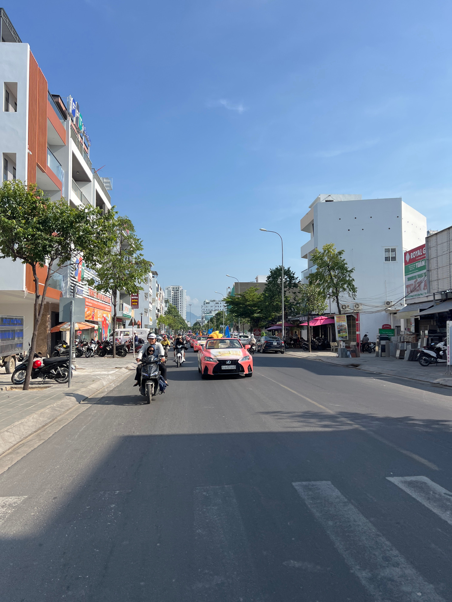 The image shows a street in Nam Nha Trang, Vietnam on a clear, sunny day. The street is lined with buildings, some of which are white with orange tiled roofs. A row of trees flanks the road. Parked mo…read more