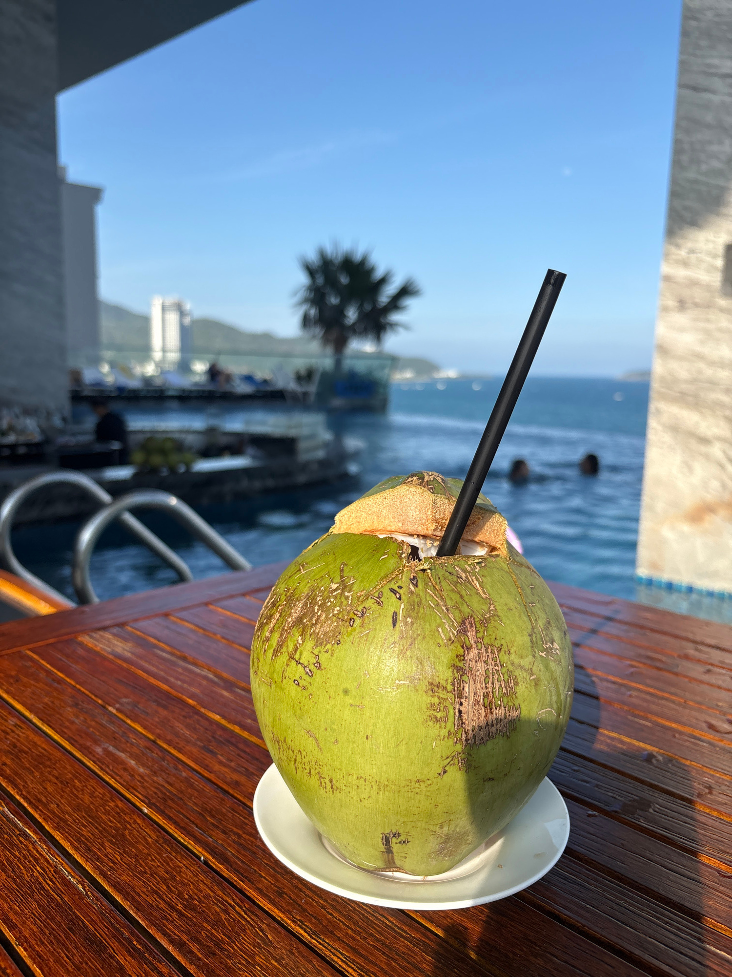 The image captures a coconut drink on a wooden table, likely near a swimming pool overlooking the ocean. The coconut, served on a white plate, has a black straw inserted. In the background, the ocean…read more