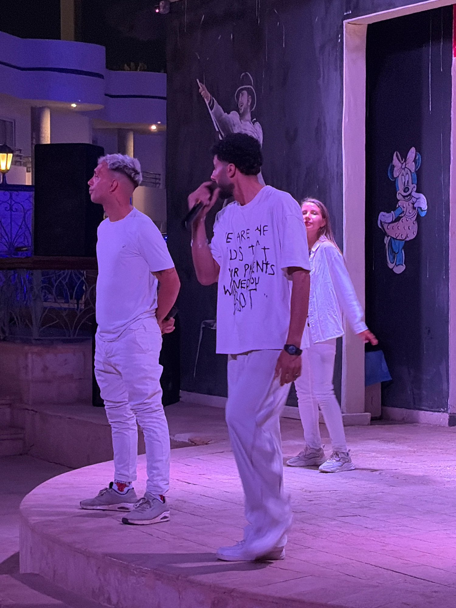 Three people stand on a stage under purple lighting. All three are dressed in white clothing. The person closest to the viewer has light blonde hair and is facing left. The second person is holding a…read more
