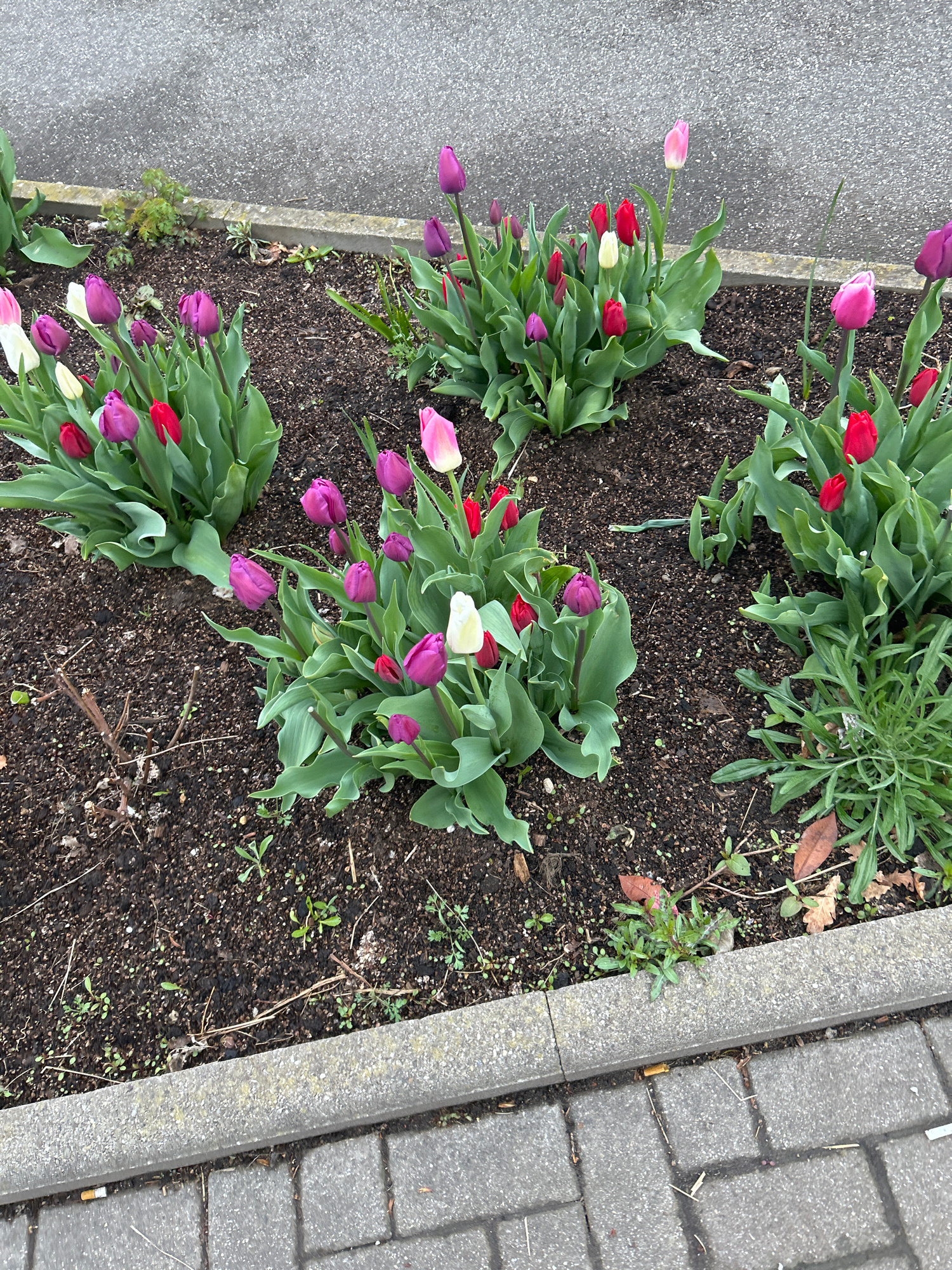 The image shows a close-up of a flower bed along a sidewalk, likely in Strasbourg, France, given the user's implied location. The flower bed contains clusters of tulips with red, purple, pink, and whi…read more