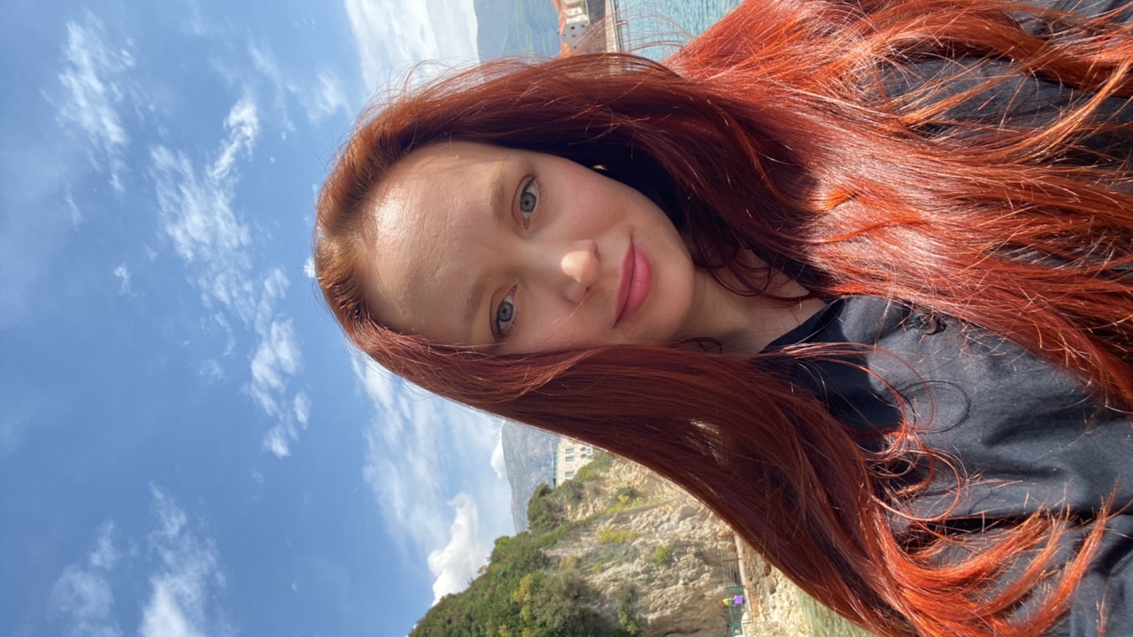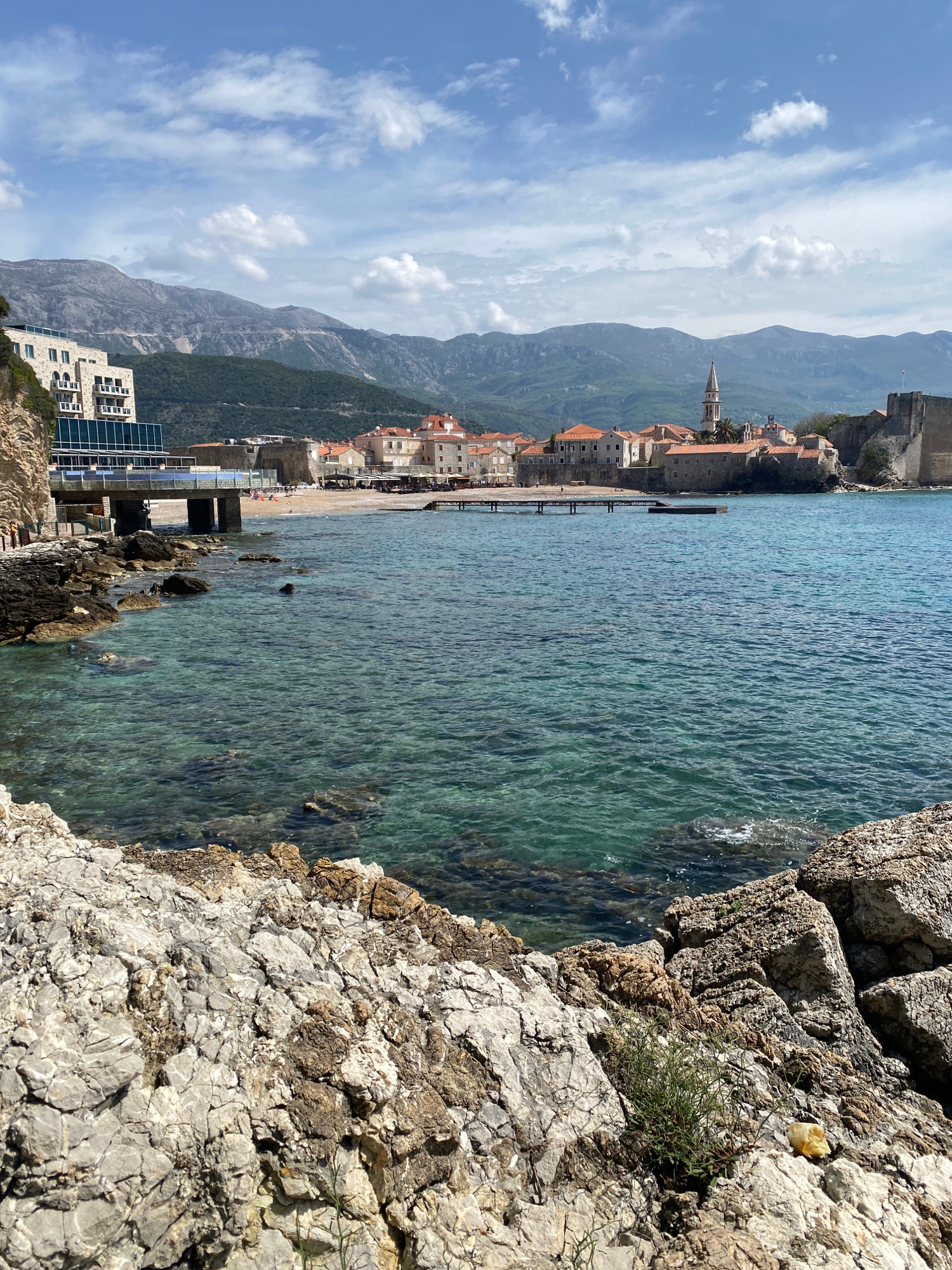 The image shows a coastal scene in Budva, Montenegro, viewed from a rocky cliff. The Adriatic Sea occupies the center, displaying clear, turquoise waters with visible underwater rocks. Adjacent to the…read more