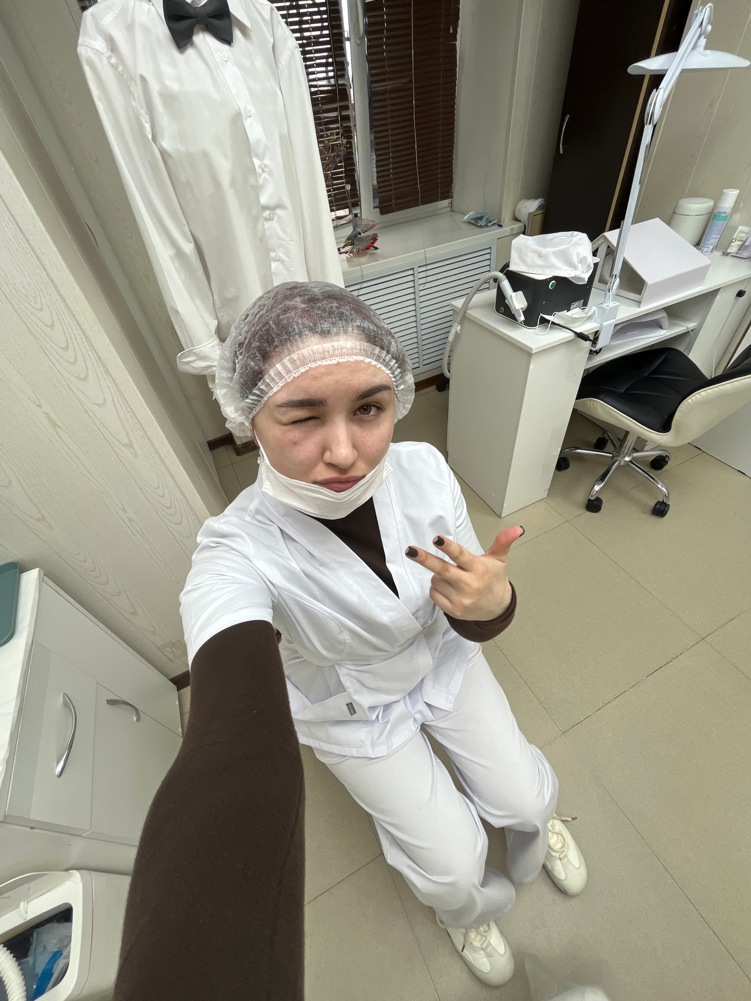 A person wearing a white medical coat, white pants, white sneakers, and a disposable hairnet is lying on a tile floor. They are winking and making a hand gesture with their left hand. A white medical…read more