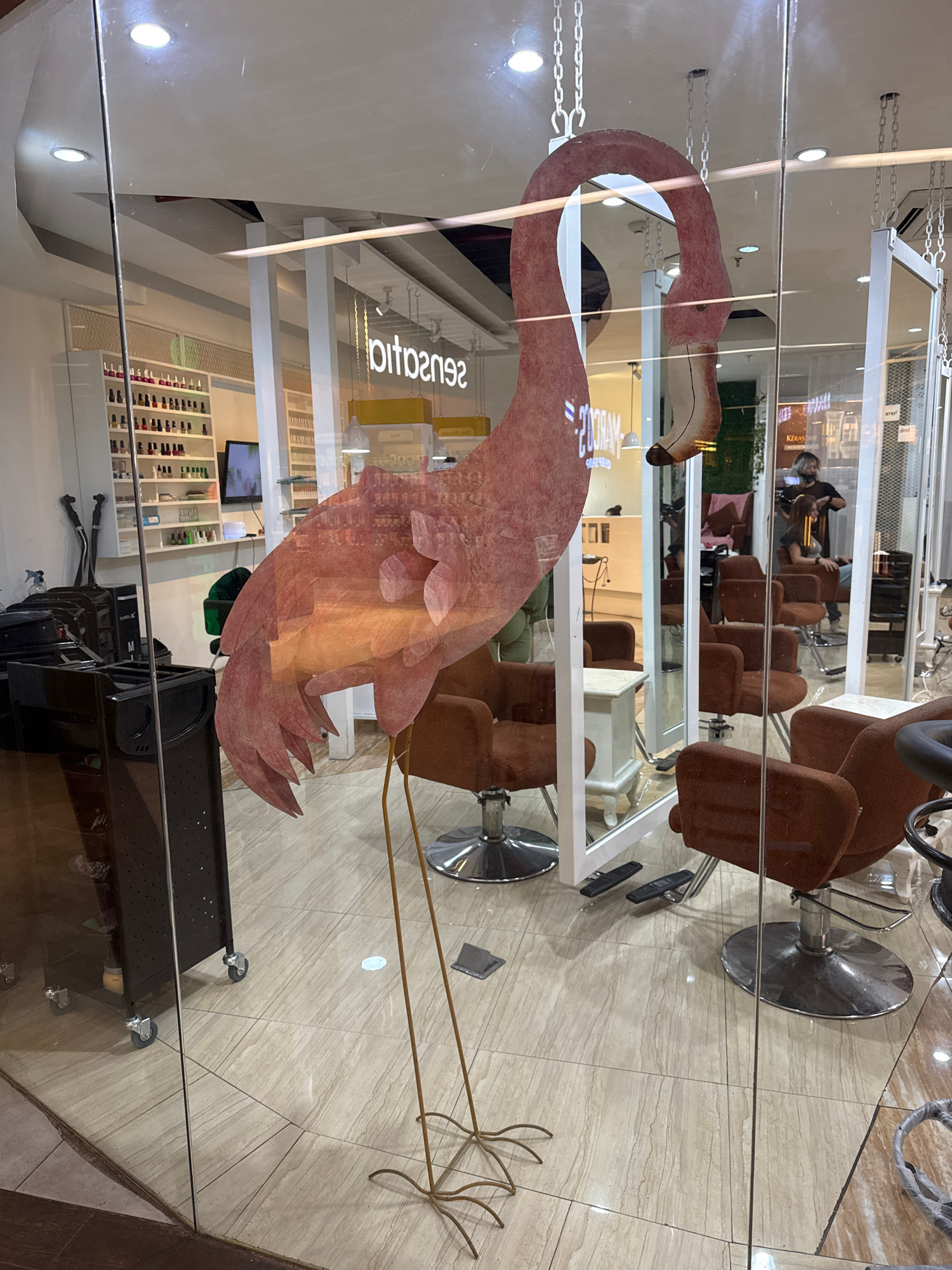 This image captures the interior of a hair salon or beauty parlor, viewed through a glass partition or window, resulting in prominent reflections. The scene is presented sideways and depicts an indoor…read more