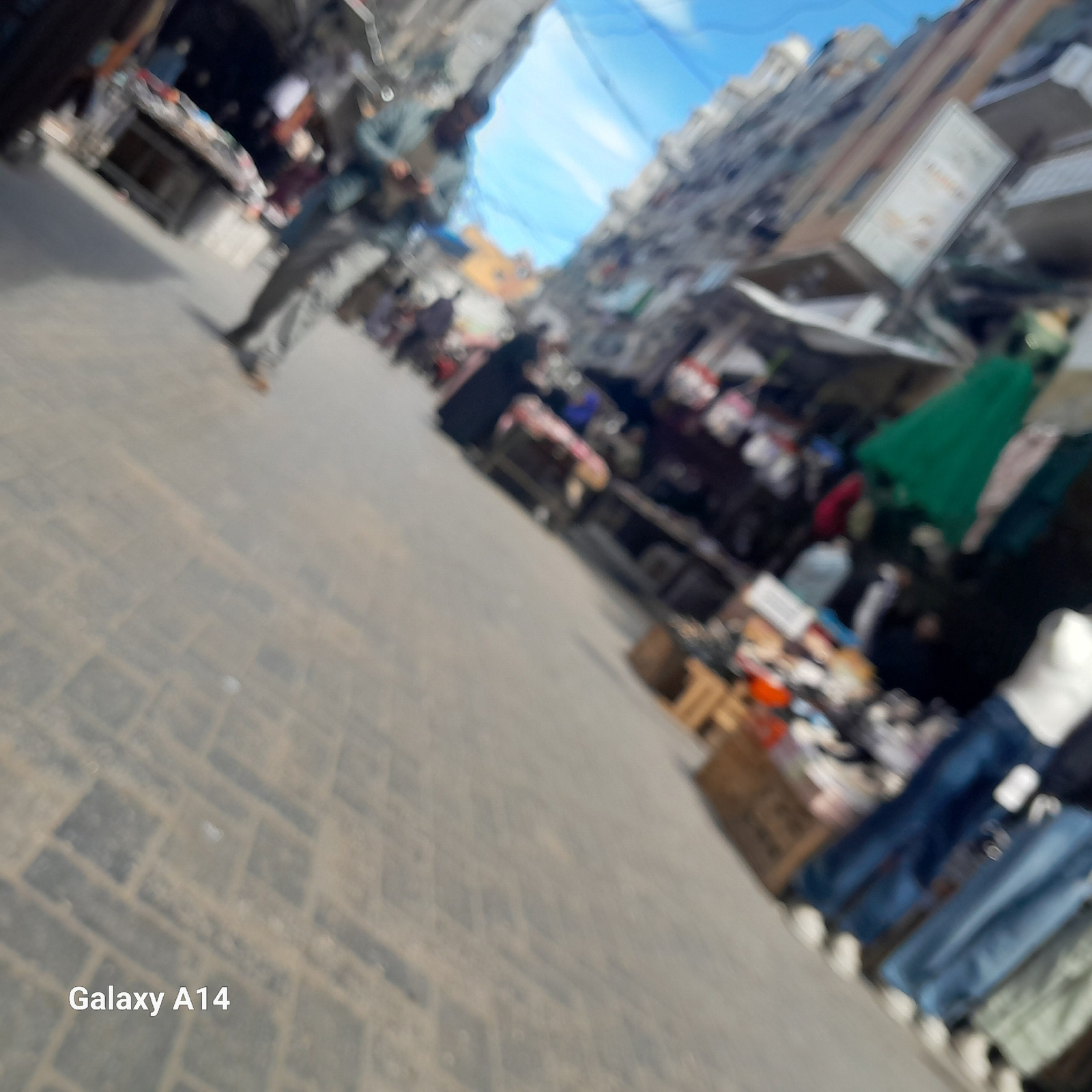 The image depicts a street scene in Nuseirat, Palestinian Territory. The street is paved with gray interlocking pavers, and lined with buildings on either side, their facades appearing somewhat weathe…read more