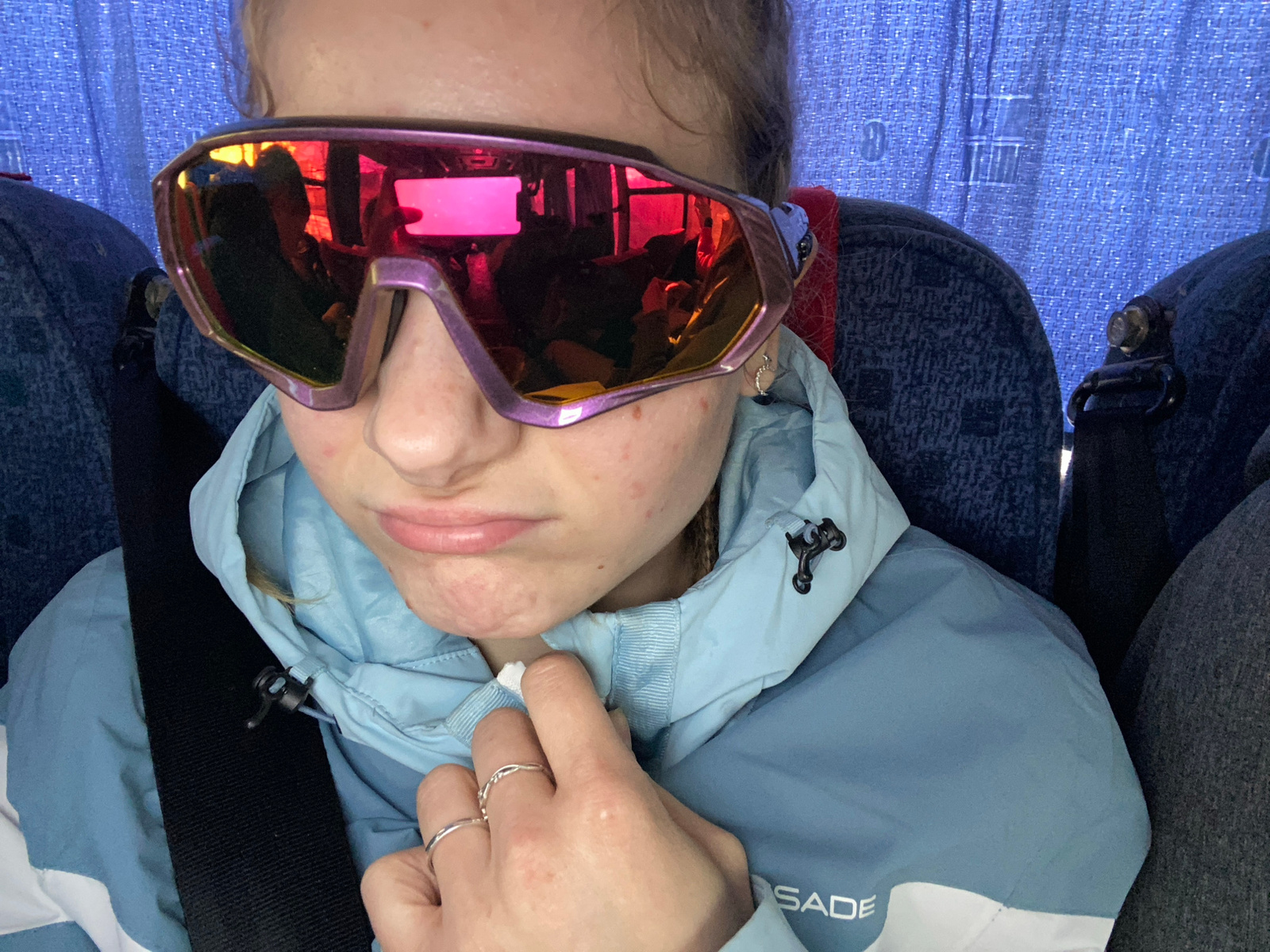 A close-up, inverted photograph shows a person wearing iridescent pink and purple ski goggles. The person is wearing a light blue jacket with a white stripe at the shoulder, and two rings are visible…read more