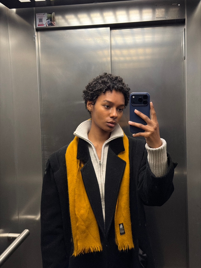 An individual is depicted taking a mirror selfie inside an elevator in Pantin, France. The subject, a young person with short, dark, curly hair and medium-dark skin, is facing forward with a neutral e…read more