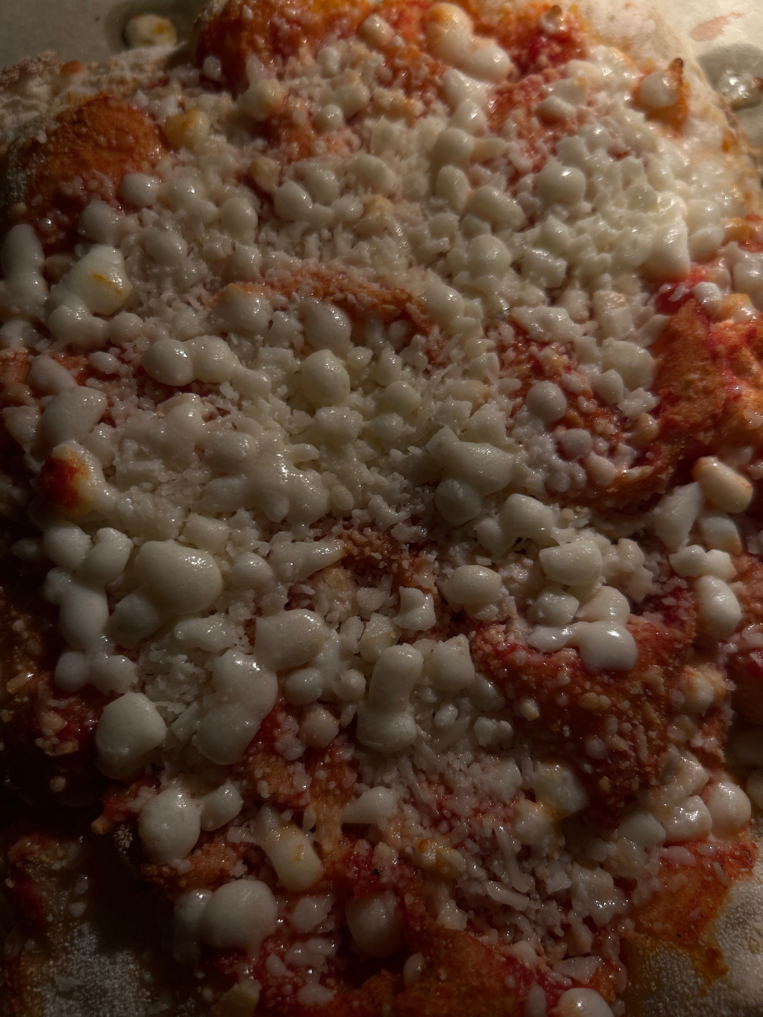 The image shows a close-up view of a pizza. The pizza has a reddish sauce base covered with small, white mozzarella pearls and sprinkled with grated cheese. The crust is visible around the edges, appe…read more