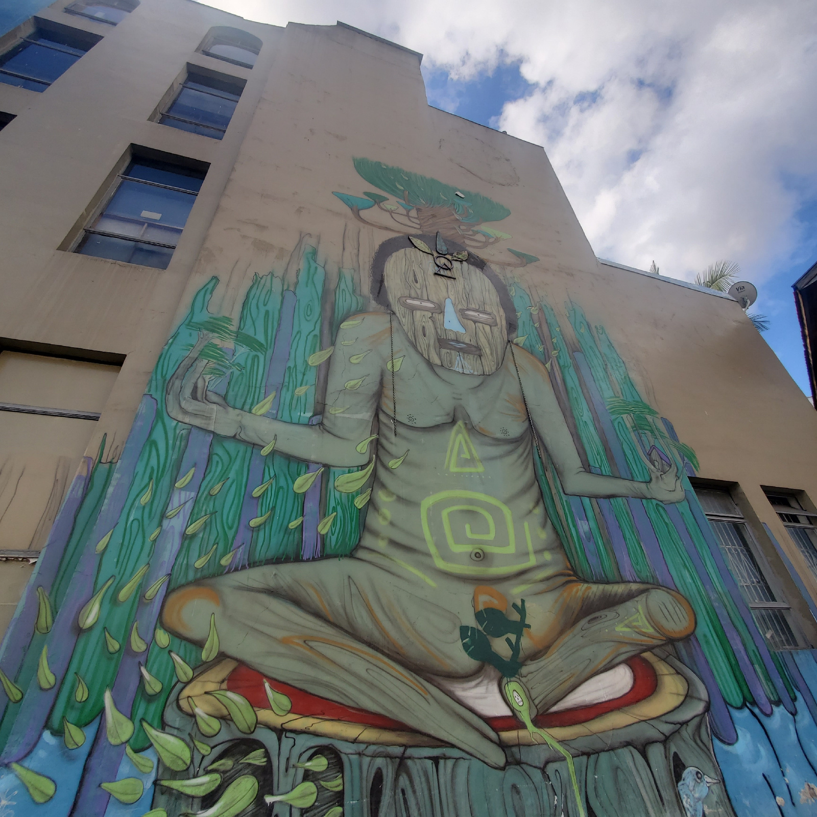A large, vibrant mural dominates the side of a light beige building, set against a bright, partly cloudy blue sky. The central subject of the mural is a stylized, serene humanoid figure, appearing as…read more