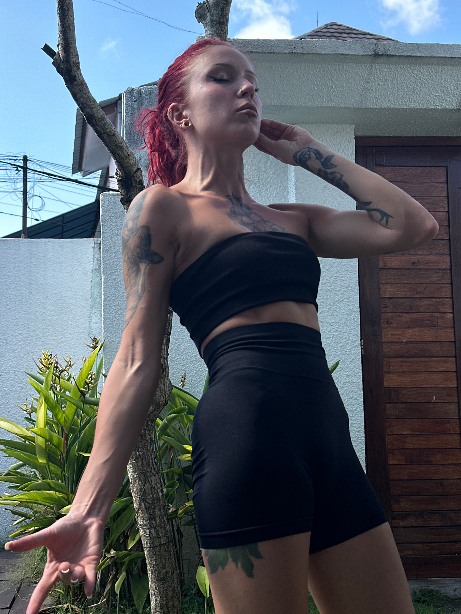 A woman with red hair is posing outdoors in Dalung, Indonesia. She is wearing a black tube top and black shorts. Her body has multiple tattoos. She is positioned on or near a tree branch. The backgrou…read more