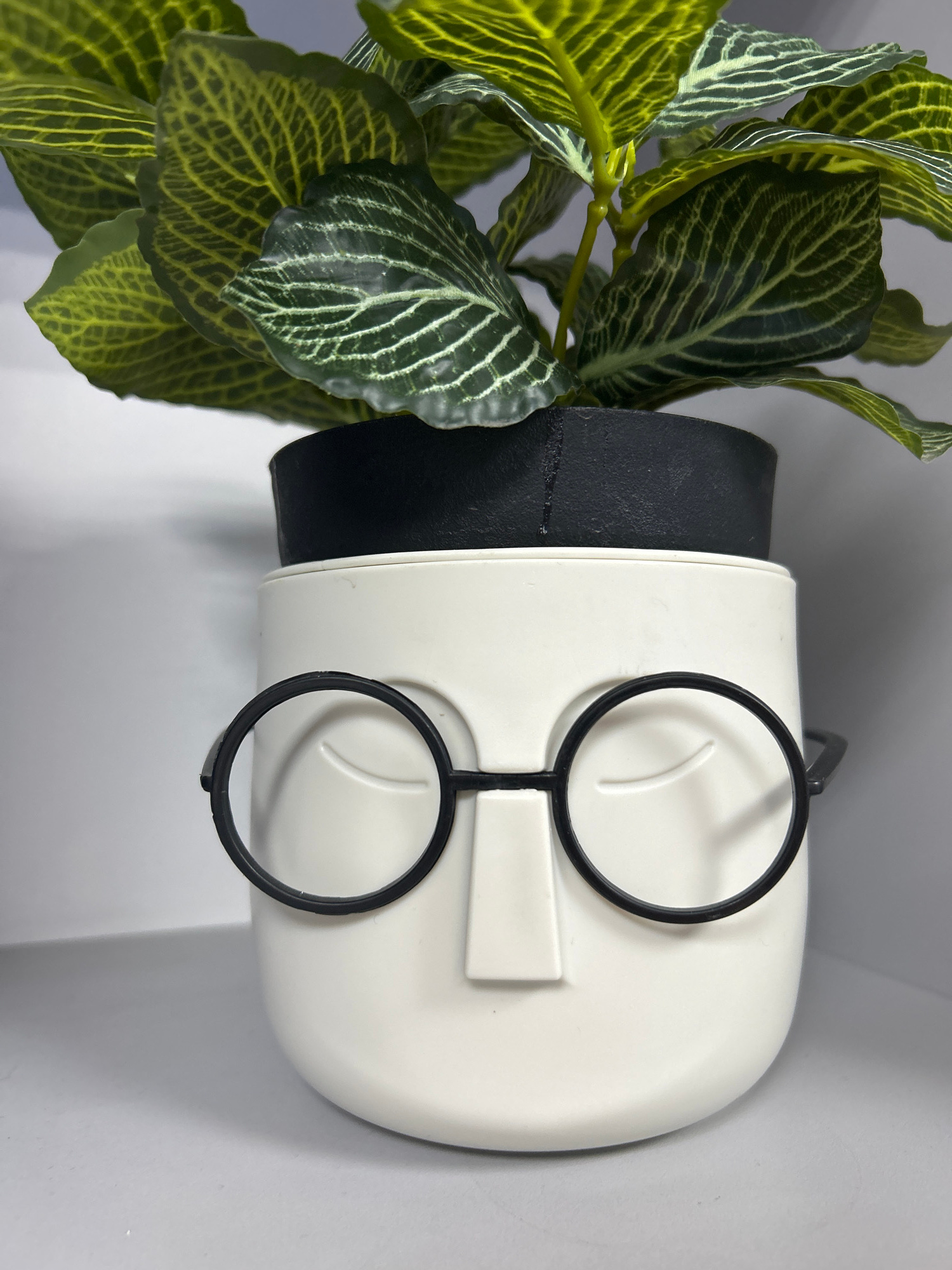 A plant with green and yellow striped leaves is potted in a white, anthropomorphic pot with black rim and black glasses. The background is a white wall and white shelf. The location is not discernible…read more