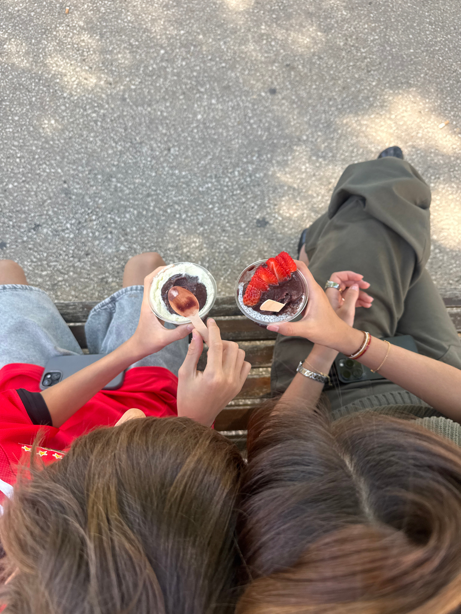 Two individuals sit on a bench. One wears green pants and a knitted top, holding a plastic cup filled with a dark substance topped with chia seeds and sliced strawberries. The other wears a red shirt…read more