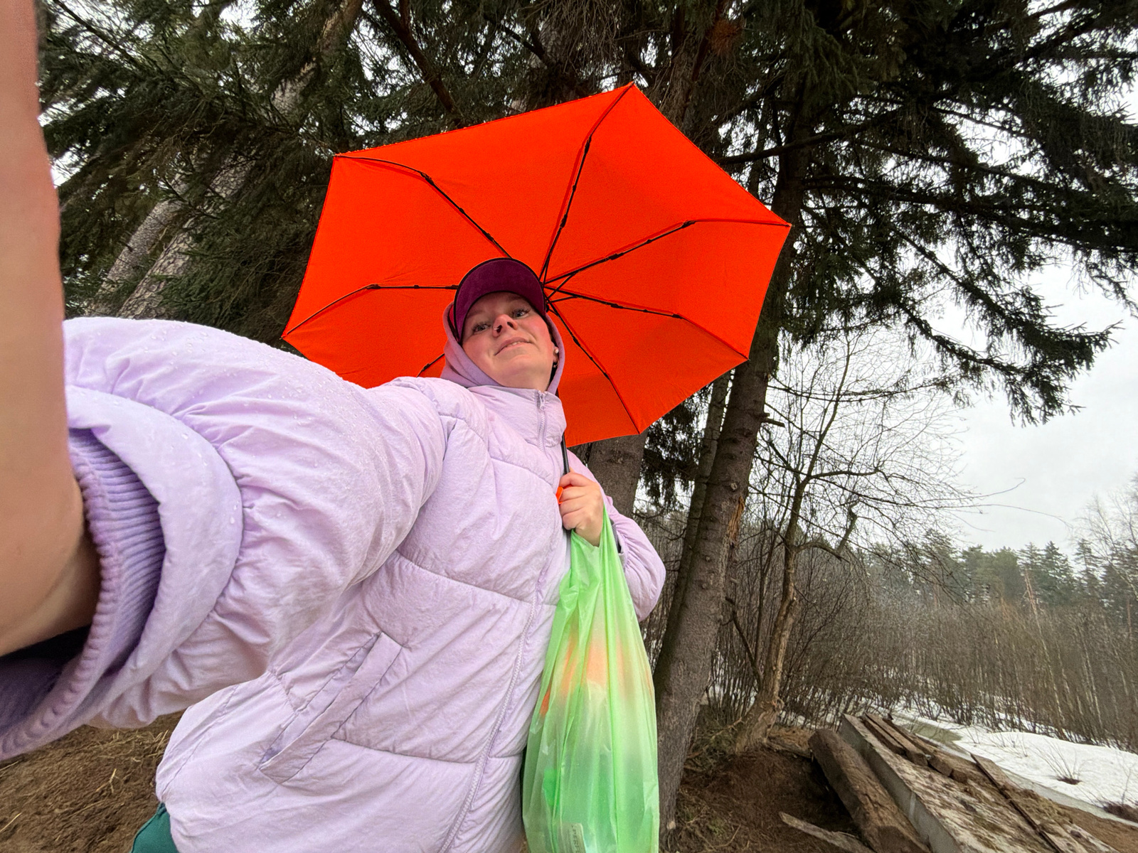 A person is holding an orange umbrella, viewed from below, with trees and a body of water in the background. The person wears a light purple puffer jacket and a dark purple cap. The location is possib…read more