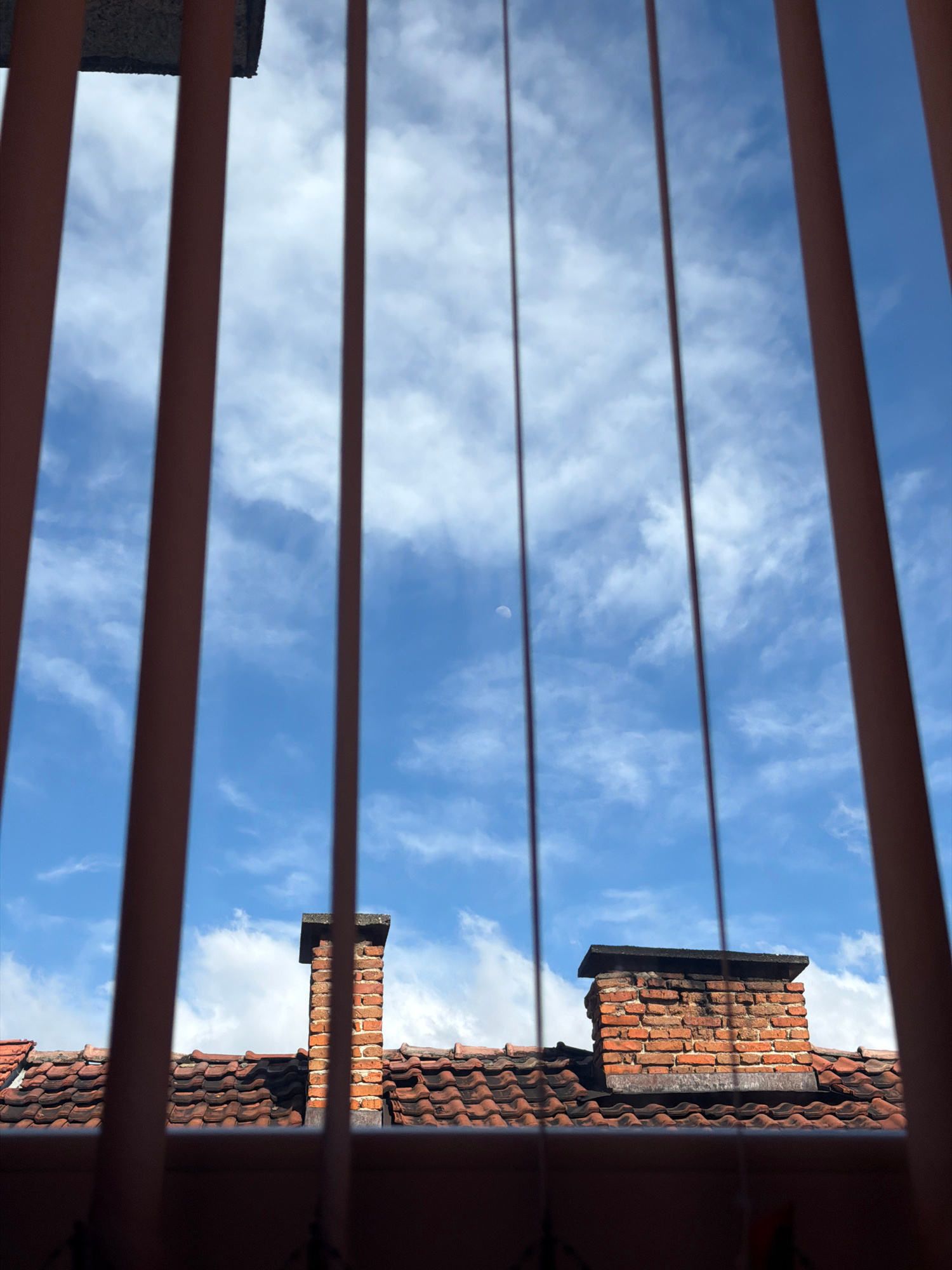 The image displays a static, daytime scene in Velingrad, Bulgaria, viewed through a series of vertical, reddish-brown bars in the immediate foreground. The midground is dominated by a terracotta-tiled…read more
