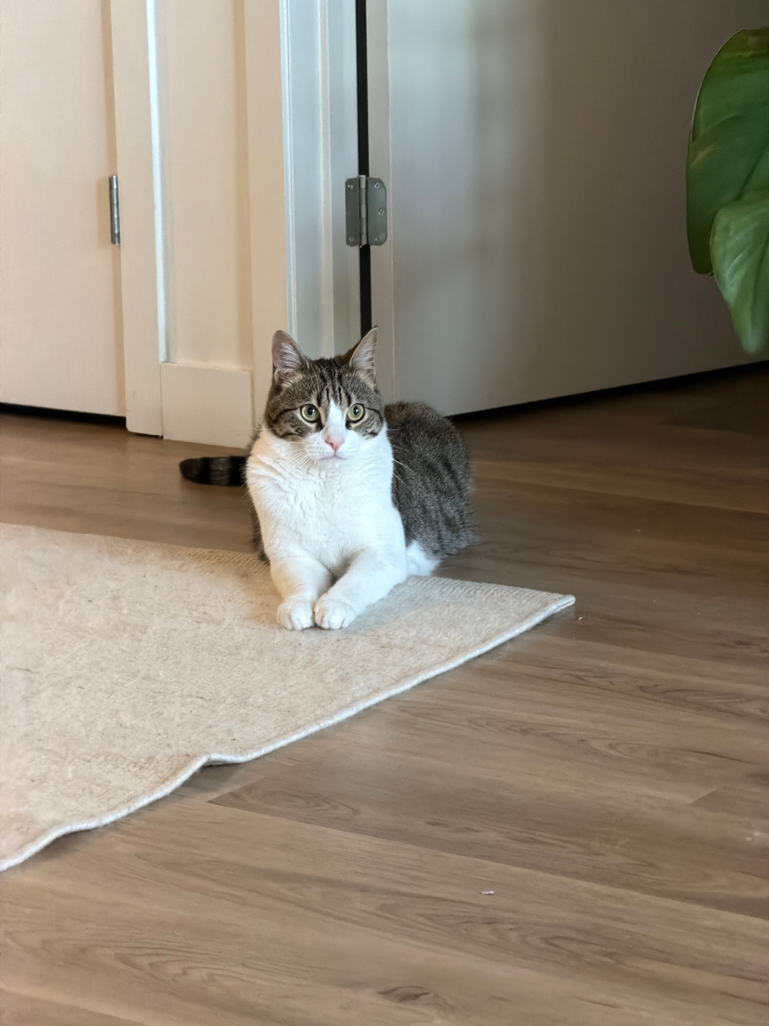 A domestic short-haired cat with gray tabby and white markings is sitting on a light-colored rug. The cat is looking up at the camera with its paws tucked underneath. Adjacent to the rug is a light-co…read more