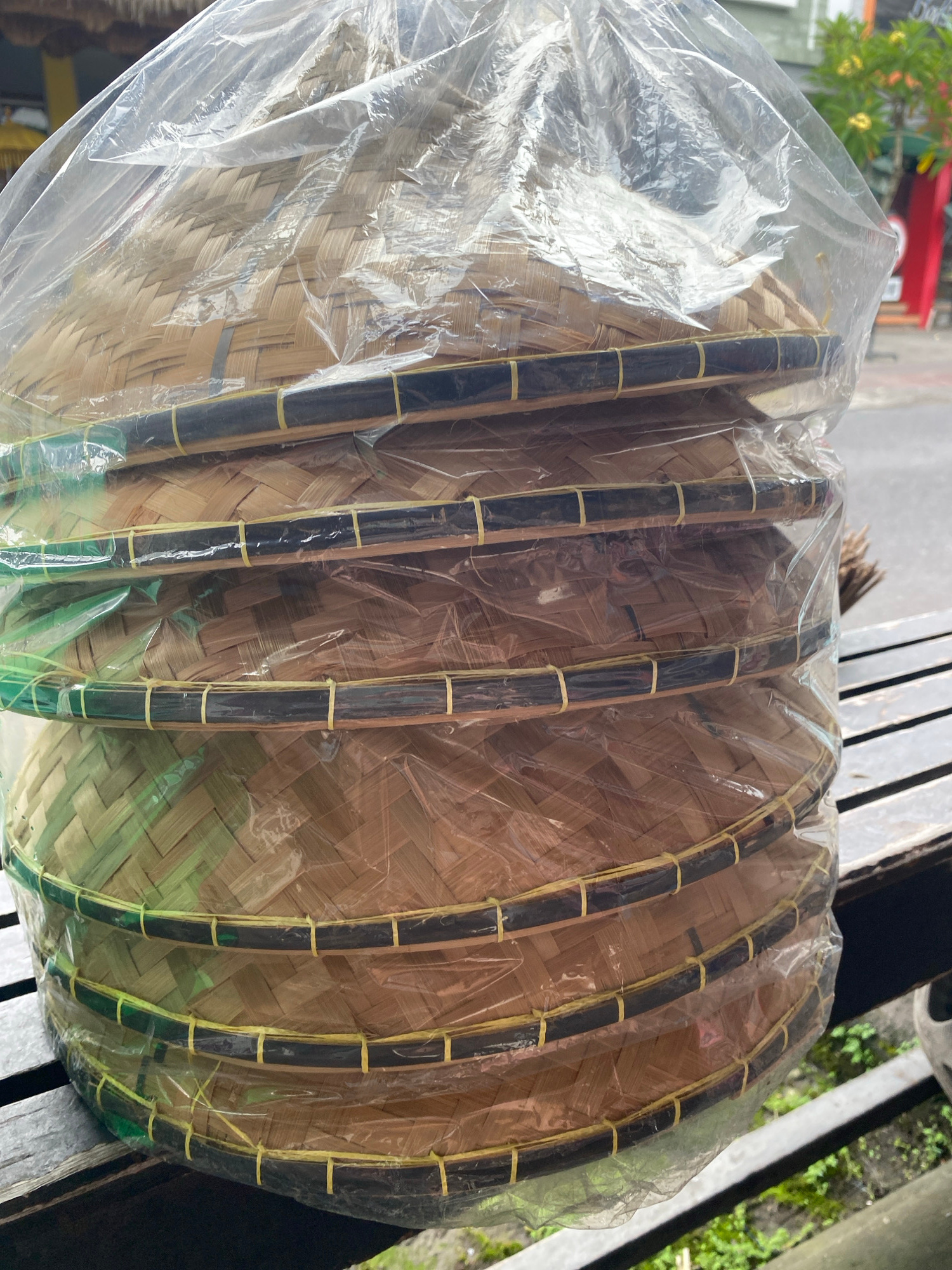 A stack of six round woven trays with dark rims, secured by thin, light-colored bands, is packaged in clear plastic. The trays rest on a weathered wooden surface with slats. In the background, there a…read more