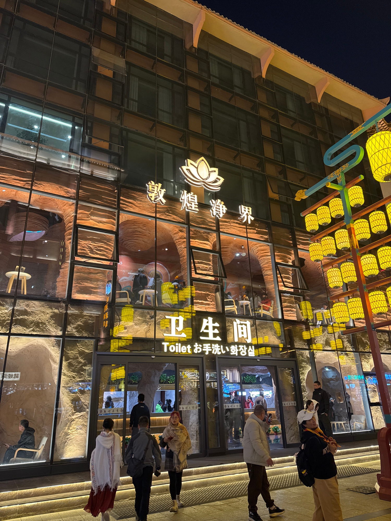The image shows the exterior of a building in Dunhuang City, China, at night. The building has a modern glass facade reflecting an interior that evokes a cave-like environment with artificial rock for…read more