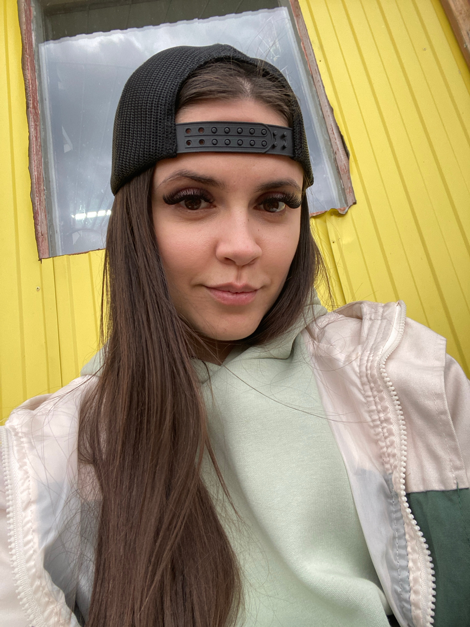 A woman with long, dark brown hair is facing the camera, wearing a black cap, a light green sweatshirt, and a white and green jacket. She is positioned in front of a yellow wall with a window to the l…read more
