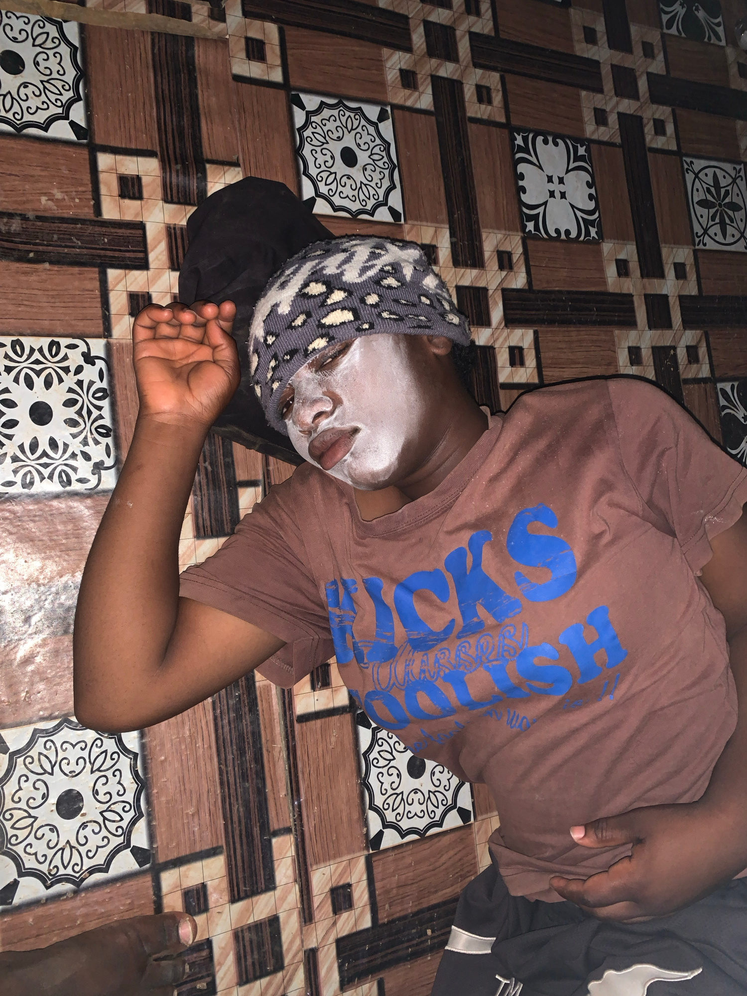A person lies on a tiled floor. The person's face is covered in a white substance. The person wears a brown t-shirt with blue lettering, and a patterned head covering. The setting appears to be indoor…read more