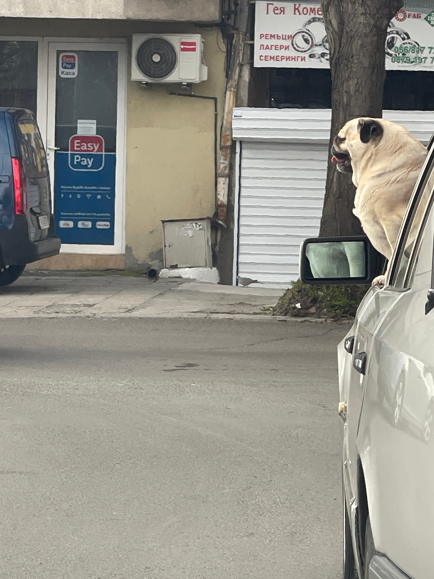 A dog is sticking its head out of the window of a white car, which is parked on a street next to a building with an "Easy Pay" sign. The building also has a sign in Cyrillic script that appears to be…read more