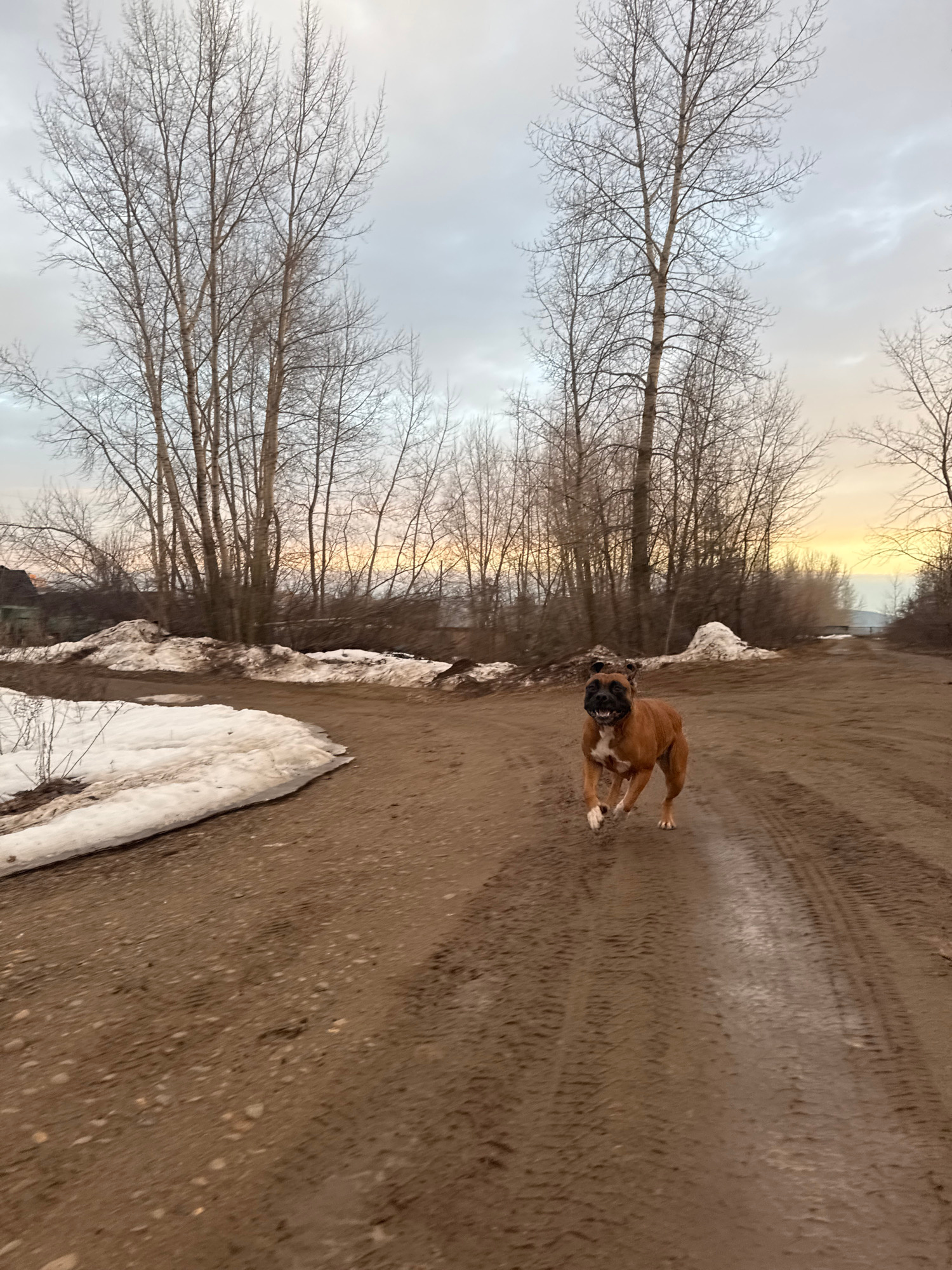The scene depicts a muddy road in Chaikovsky, Russia, flanked by patches of melting snow and bare trees. In the foreground, a brown Boxer dog is running towards the camera. Tire tracks are visible in…read more