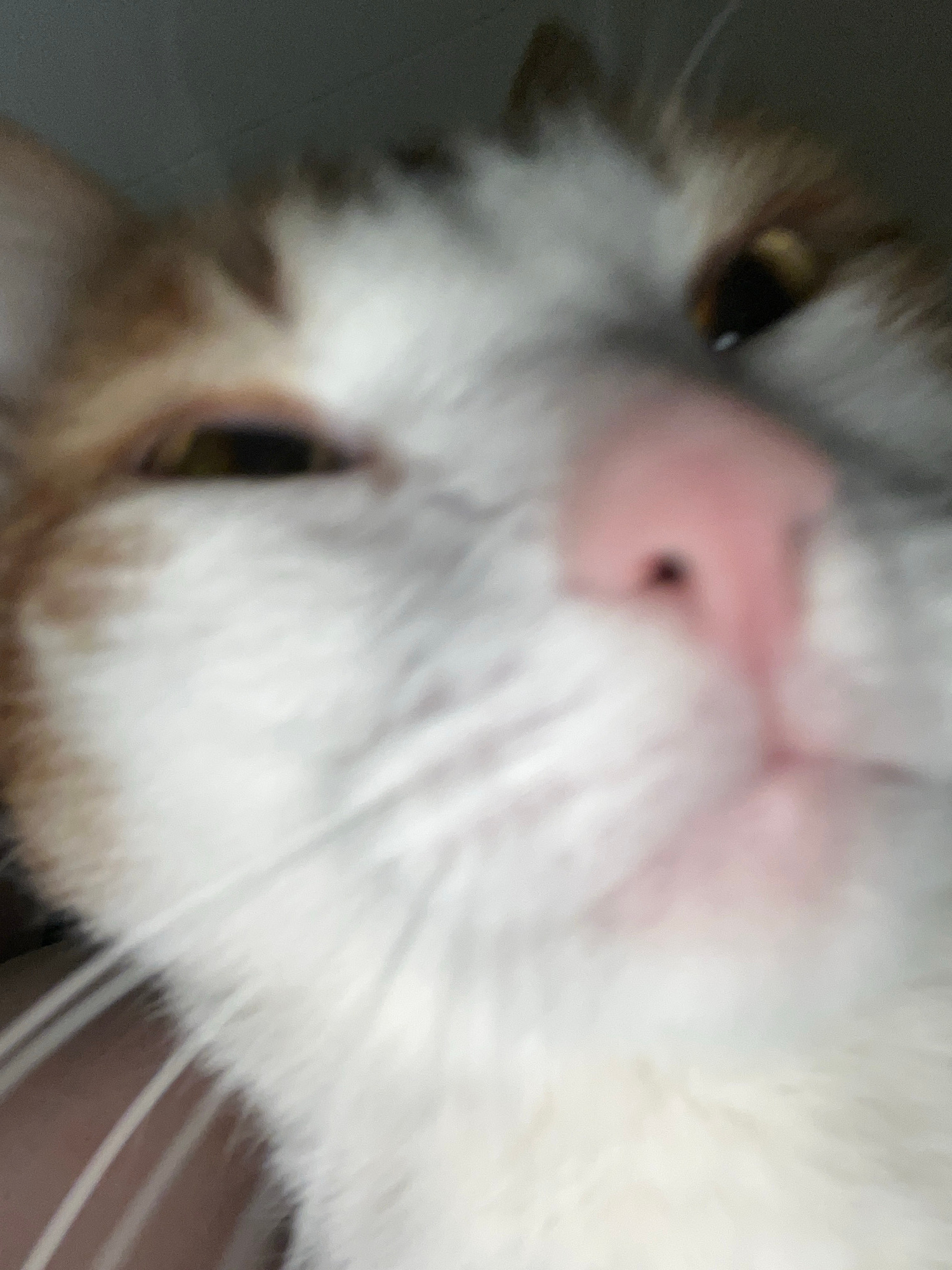 Close-up, slightly blurred view of a cat's face. The cat has white and brown fur, a pink nose, and yellow-green eyes. The cat is positioned upside down in the frame. Thin, light-colored whiskers are v…read more