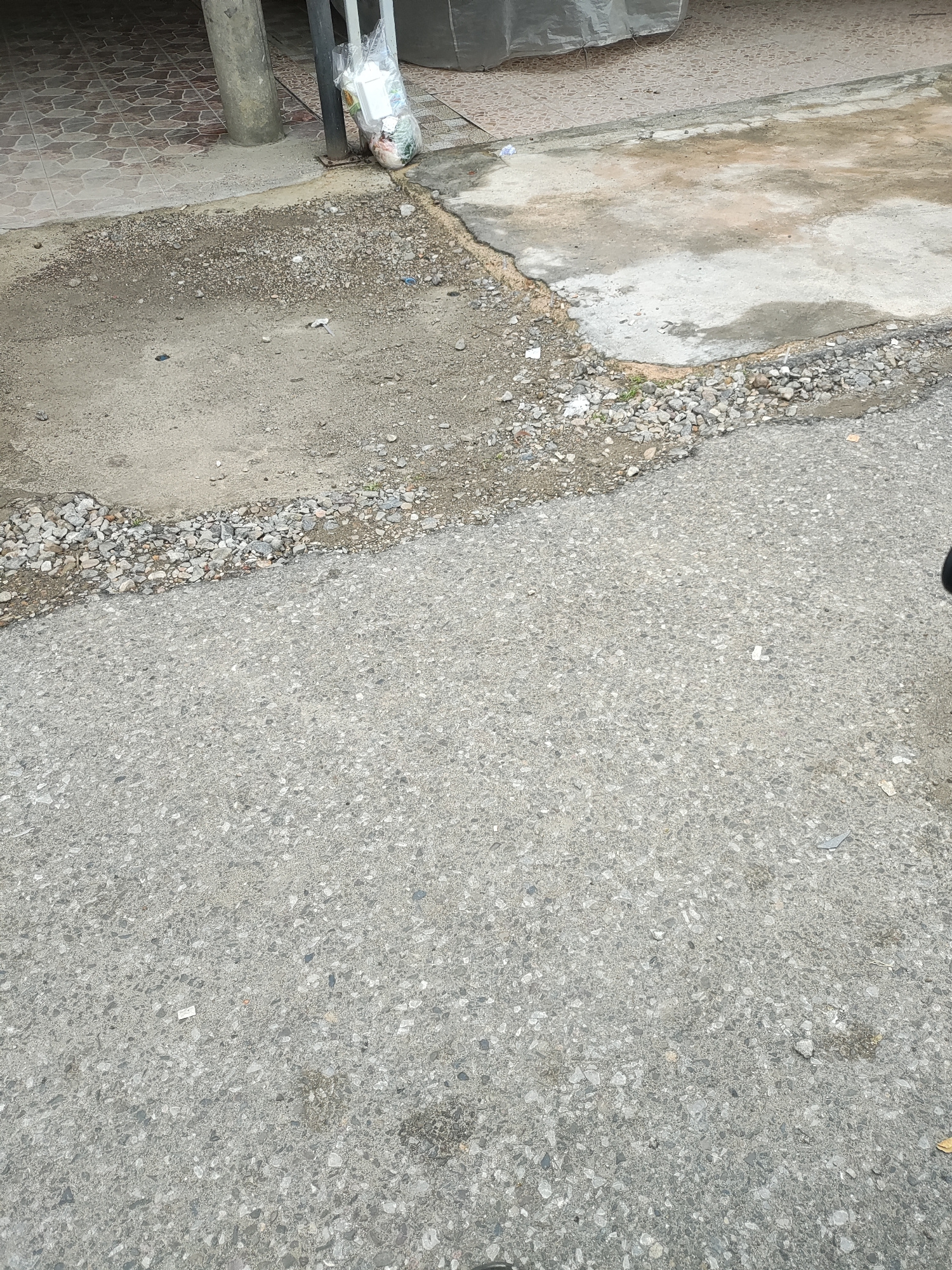 The image shows a portion of a street or road in Lhokseumawe, Indonesia. The surface is asphalt with a medium-grey tone. The foreground is mostly the street surface. The upper portion of the image shows a section of sidewalk or adjacent pavement, exhibiting a mix of textures and materials. A covered area, possibly a building overhang, can be seen at the top left. There is a trash bag located near a pillar. The transition between the road surface and the sidewalk is irregular, with small rocks and debris along the edge. No people, animals, or vehicles are visible in the frame. The lighting appears to be natural and overcast. | Open Wire